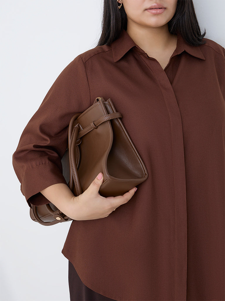Crafted from a lightweight fabric, this dark brown shirt from Gia offers a contemporary profile in a solid finish. The classic collar leads into a concealed metallic button placket for a refined touch, while the three-quarter sleeves keep the silhouette modern and easy to style.