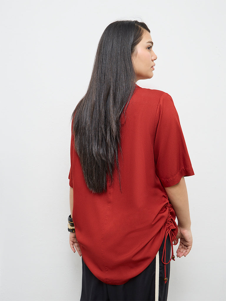 This rust blouse from Gia is defined by ruched details with drawstrings on each sides for a subtle elevation. Made from a smooth, lightweight fabric, it gives an ultra-soft feel on the skin. The design features a Mandarina collar and short sleeves for a minimal front. This is a versatile piece to pair with coordinated bottoms or contrasting separates for day-to-day styling.