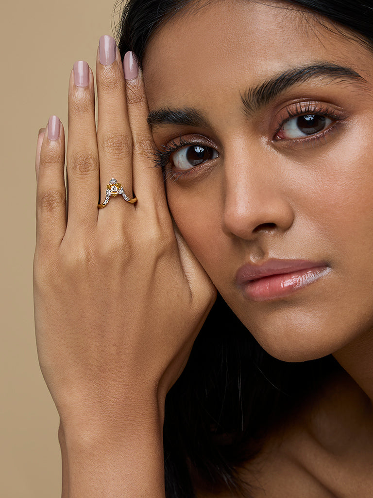 Westside X Pome presents this gold multilayer rose V ring, designed with a polished gold-tone band that elegantly splits into a V-shape design, adorned with clear stones. At the center, a layered rose motif is accented with additional clear stones, enhancing its intricate detailing and charm.