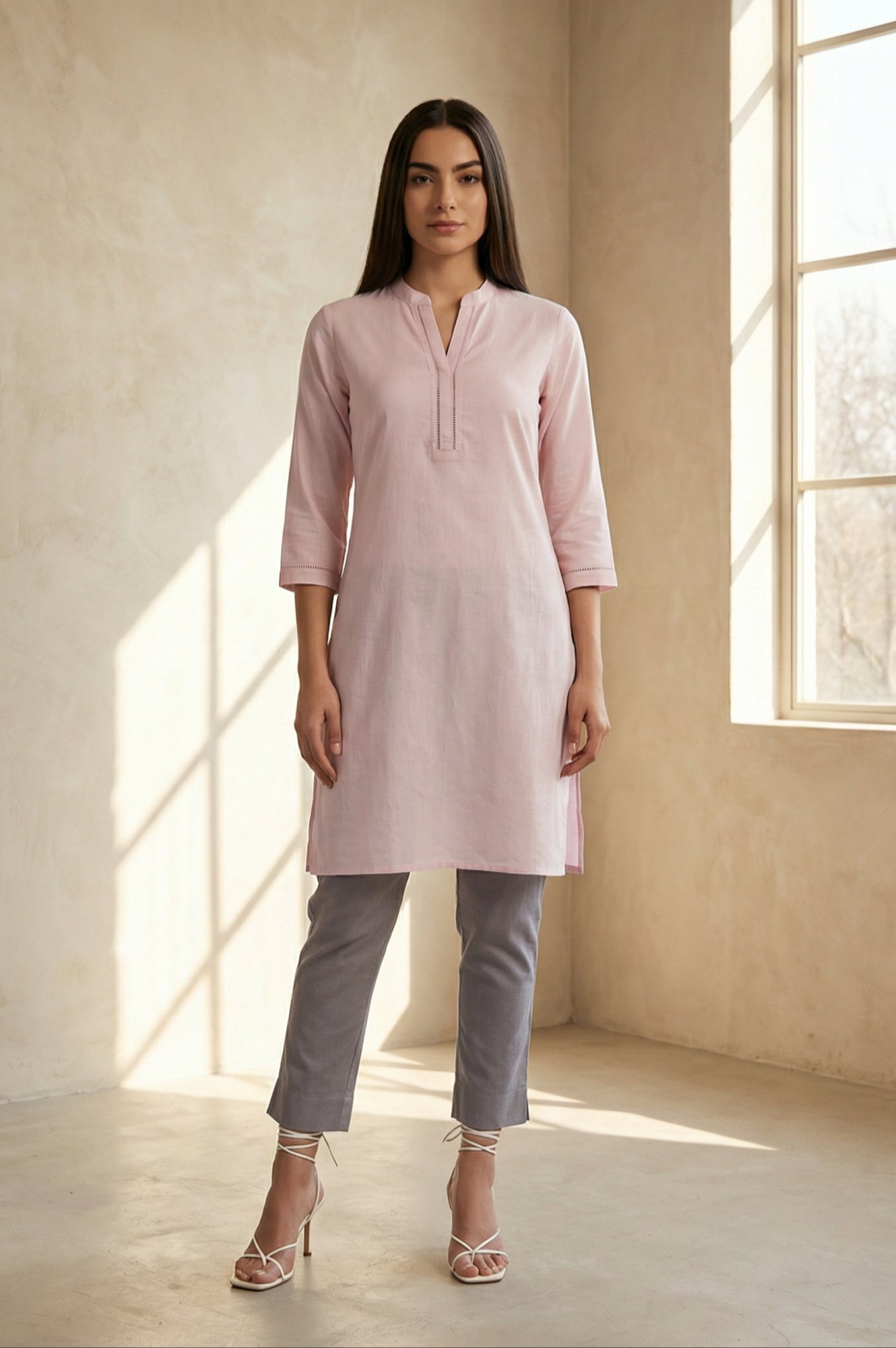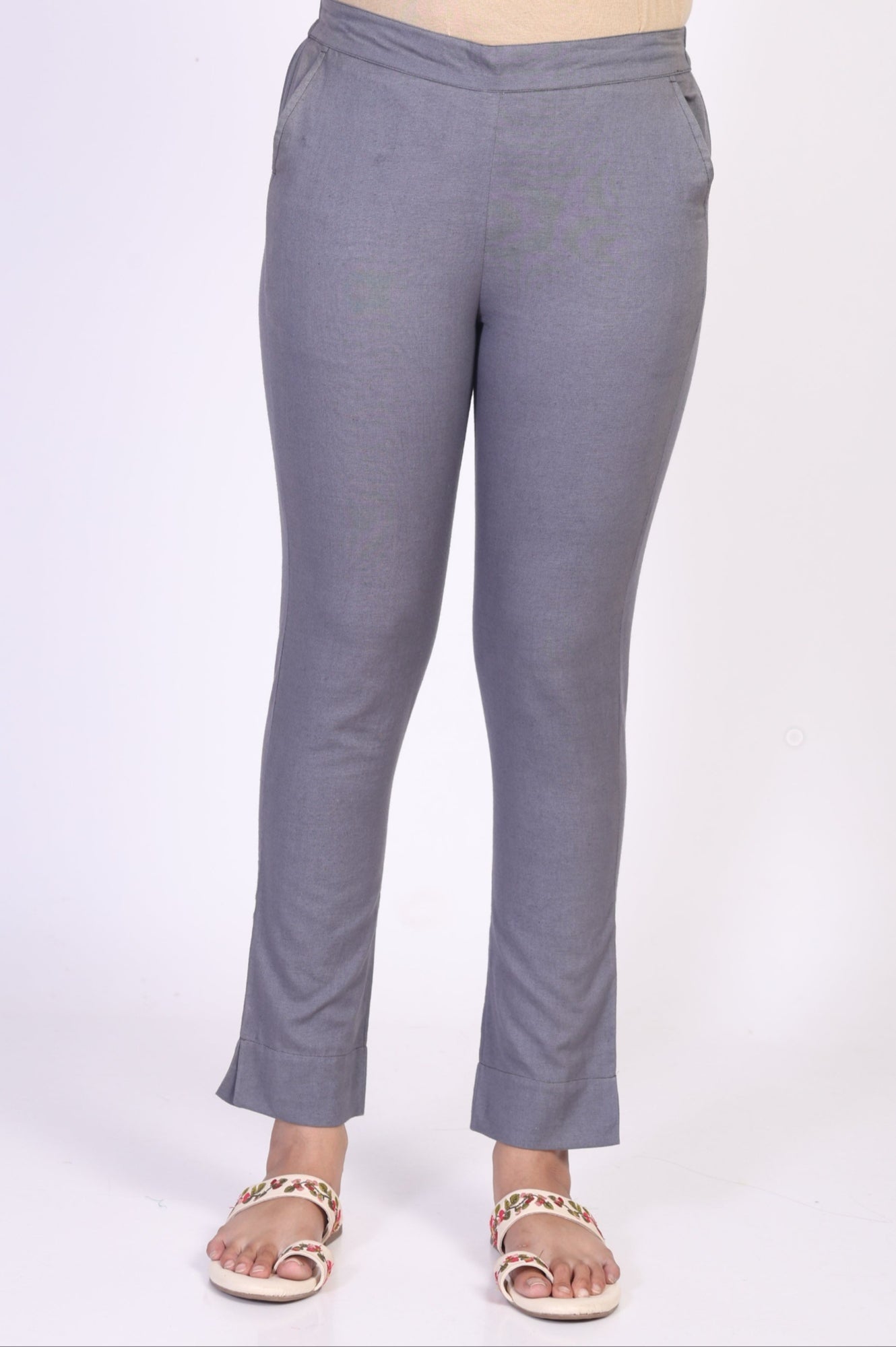 Softly tailored for everyday elegance, these grey slim-fit trousers for women combine comfort and style. The elasticated waistband ensures a snug fit, while the breathable cotton fabric makes them perfect for summer wear. With a sleek ankle-length hem and slant pockets, these trousers are versatile for casual outings or office wear. Pair them with a pastel kurta or a crisp shirt for a polished look. Machine washable for easy care, they retain their shape and color even with regular use.
