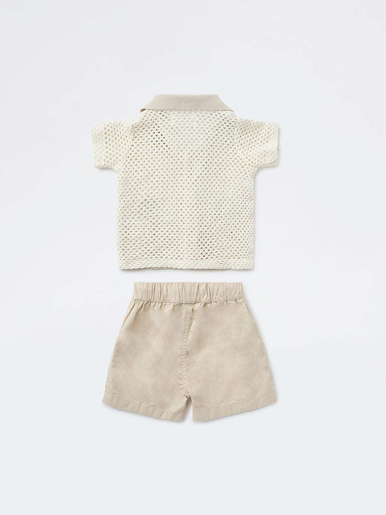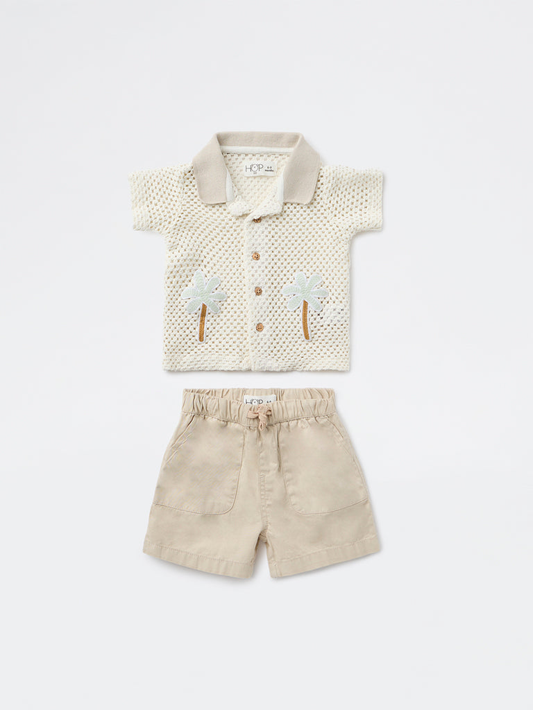 HOP Baby Boys White Crochet-Knit Cotton Shirt and Shorts Set
