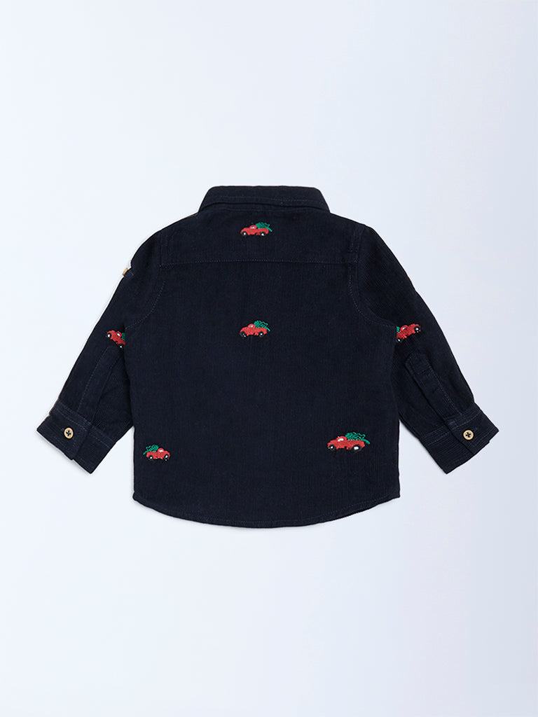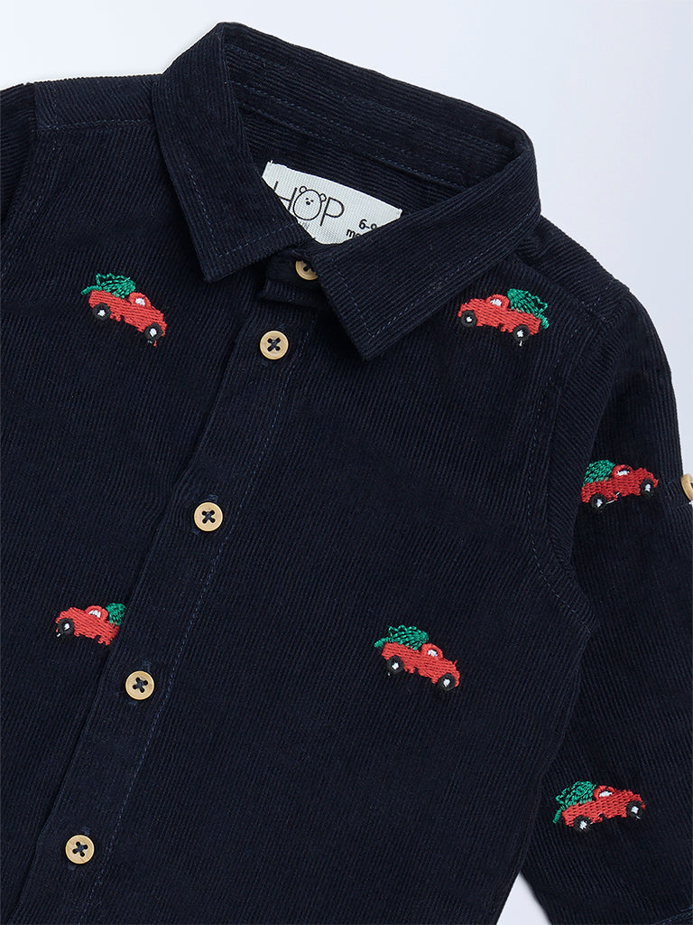 HOP Baby presents a navy corduroy shirt made from pure cotton for a soft, breathable feel against delicate skin. The classic collar, button placket and buttoned cuffs offer a dressed-up look, while tiny car embroidery throughout adds a playful, baby-friendly touch. Perfect for outings where comfort and cuteness go hand in hand.