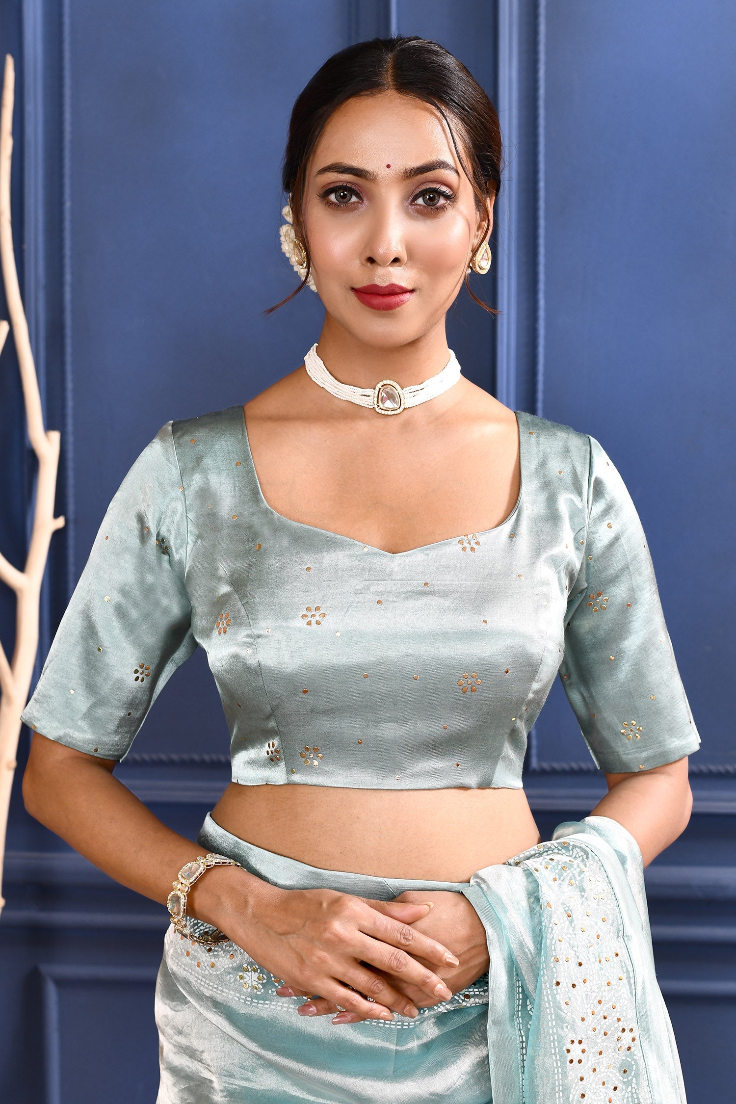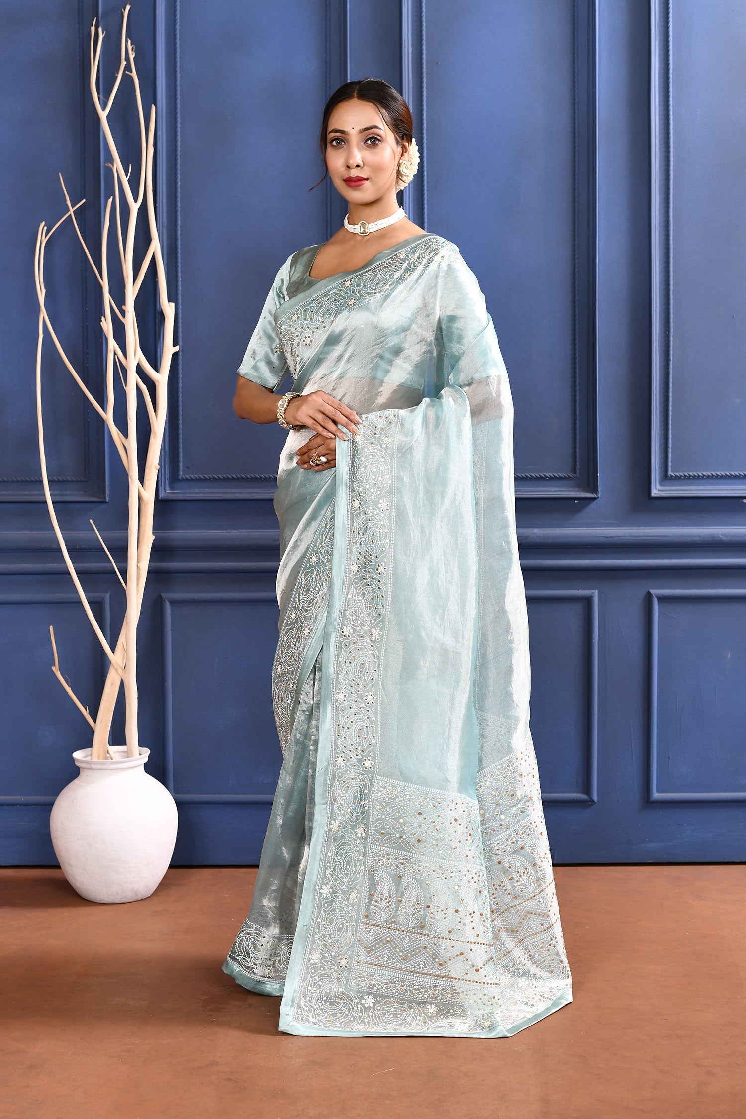 The jewel blue foil printed tissue saree with self border and blouse for a rich look along with foil printed floral design for subtle grace.