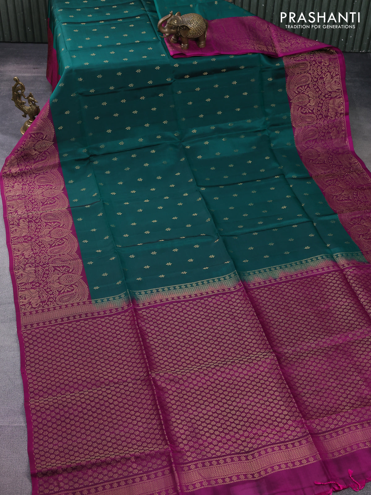 Kanchipuram soft silk saree peacock green and purple with allover zari woven buttas and long zari woven border