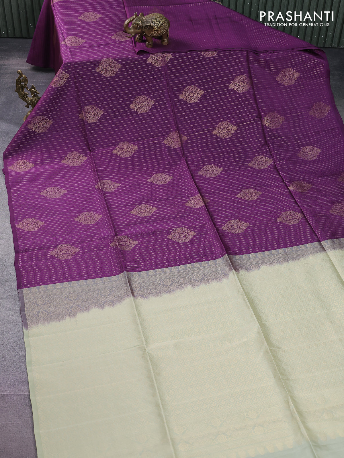 Kanchipuram soft silk saree purple and mild pista green with allover zari weaves in borderless style