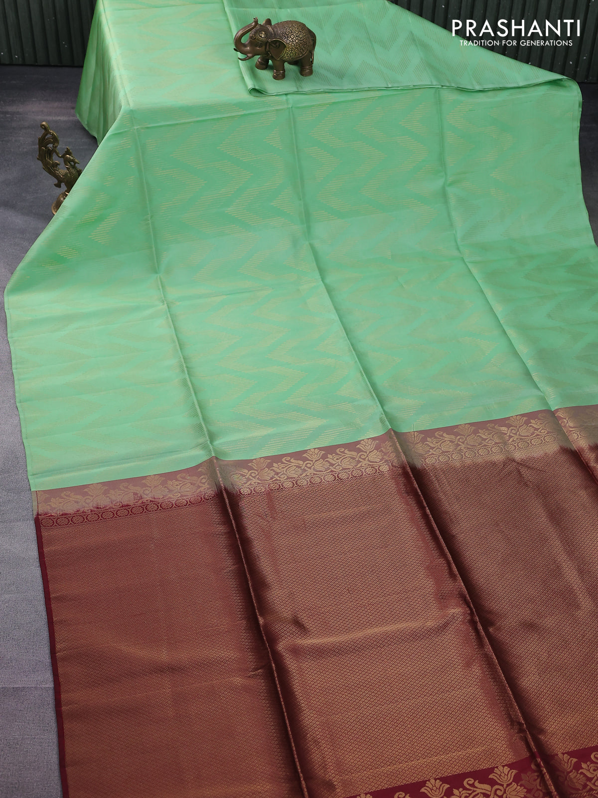 Kanchipuram soft silk saree teal green shade and maroon with allover zig zag zari weaves in borderless style