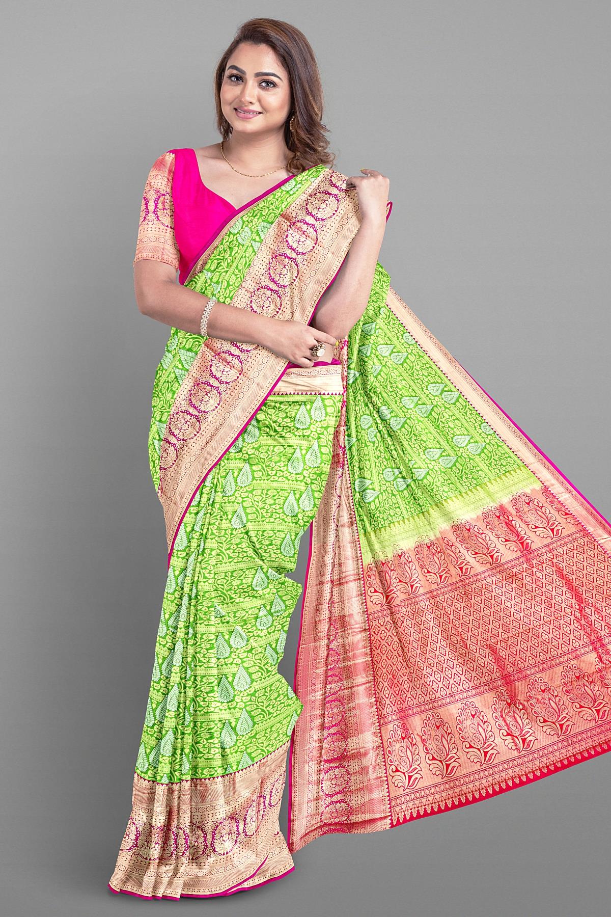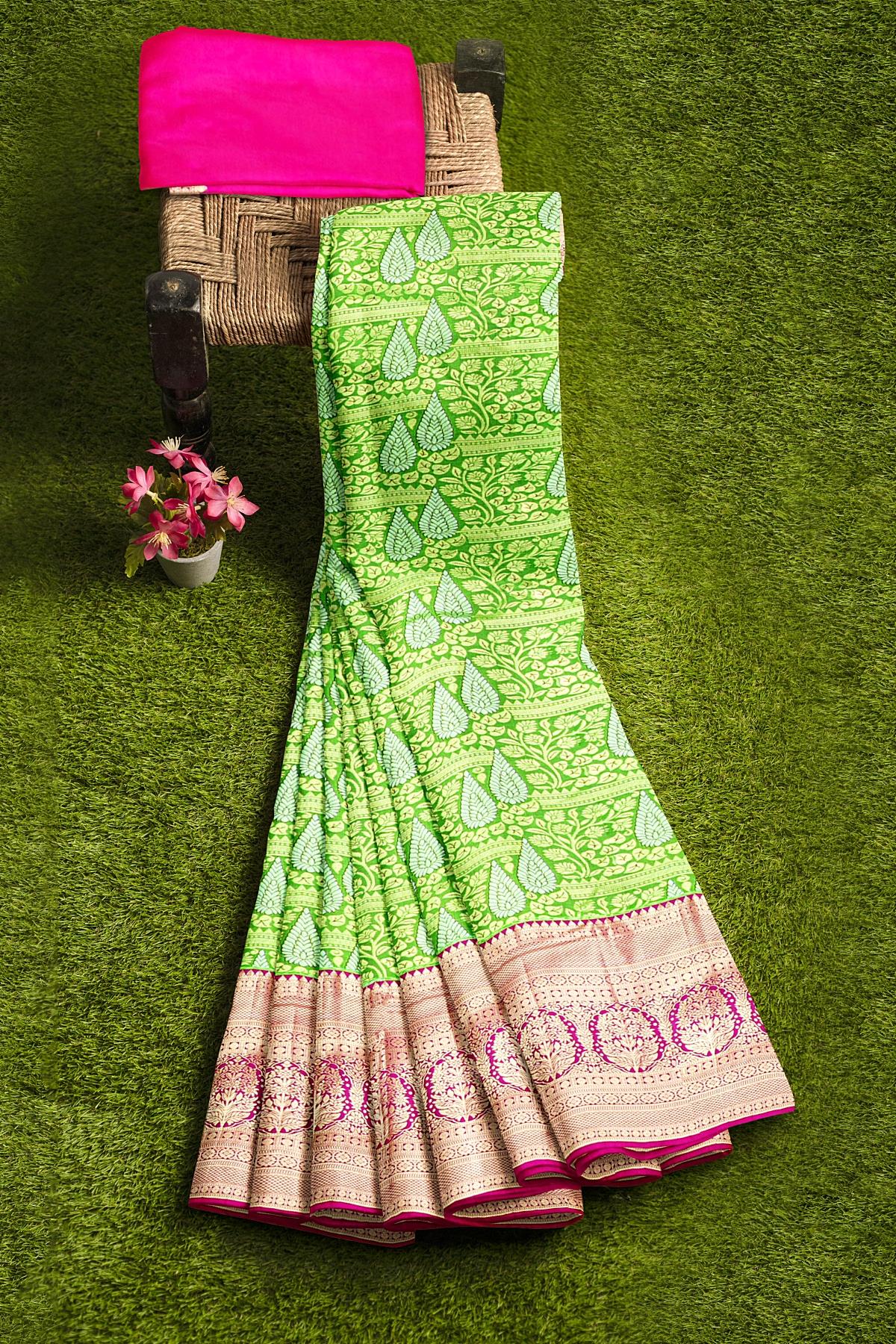 Latest LIGHT GREEN FLORAL JAAL SILK BLEND Saree with CONTRAST ZARI border. This saree comes with PLAIN WITH BORDER SILK BLEND blouse.
