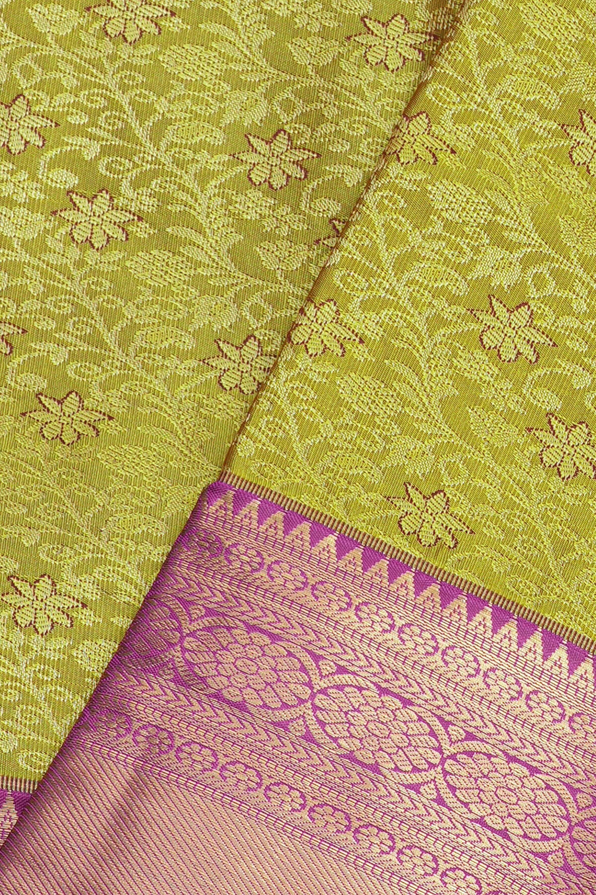 Latest LIGHT GREEN FLORAL JAAL SILK BLEND Saree with CONTRAST ZARI border. This saree comes with PLAIN WITH BORDER SILK BLEND blouse.