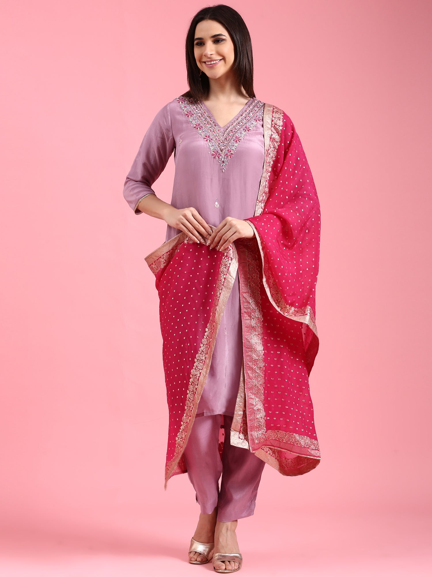 Lilac Organza Hand Embroidery Three Piece Suit Set