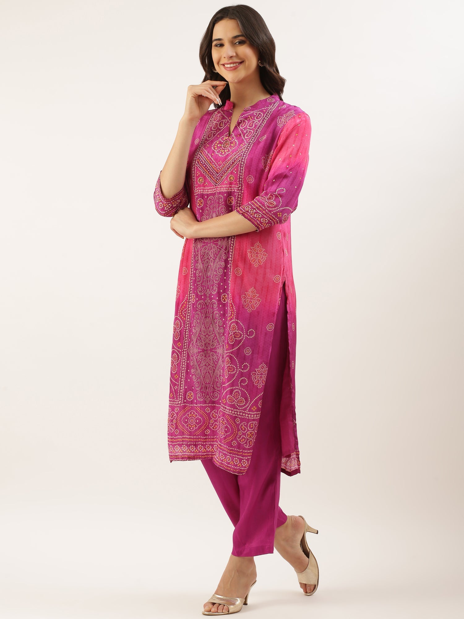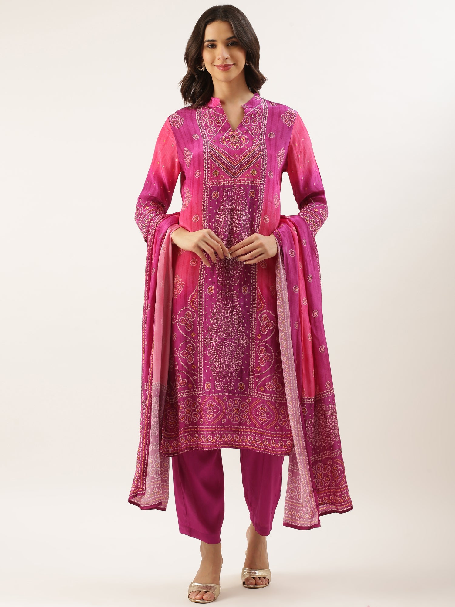 Magenta Muslin Bandhani Printed Three Piece Suit Set