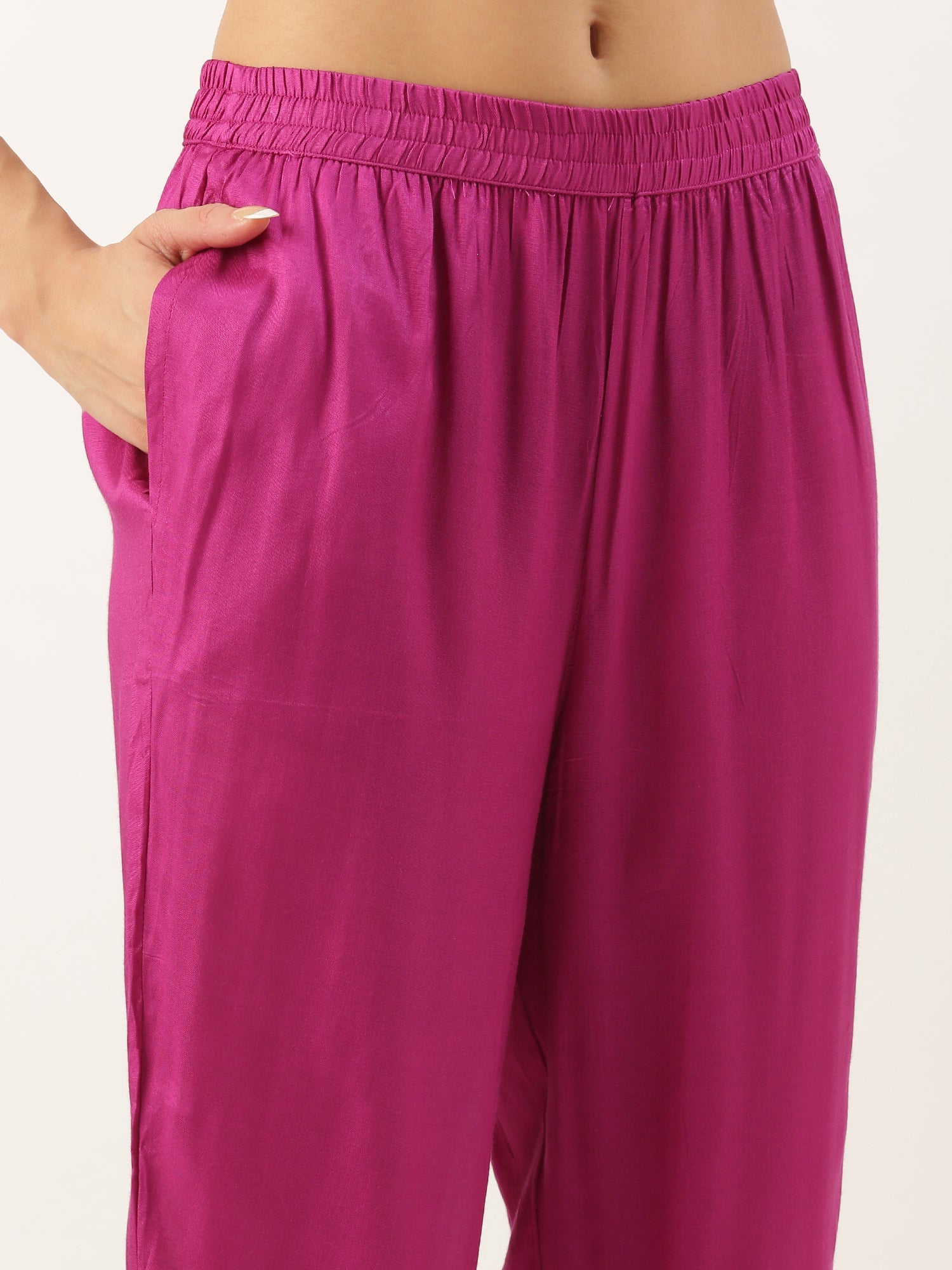 Experience timeless elegance with the Magenta Muslin Bandhani Printed Three Piece Suit Set. Crafted from soft muslin fabric, this set features traditional Bandhani print that adds vibrant charm and cultural richness. The lightweight material ensures comfort and breathability, making it ideal for all-day wear. Perfectly coordinated, the three pieces allow versatile styling for festive occasions or casual gatherings. Elevate your ethnic wardrobe with this expert-crafted ensemble that blends classic artistry with contemporary comfort.