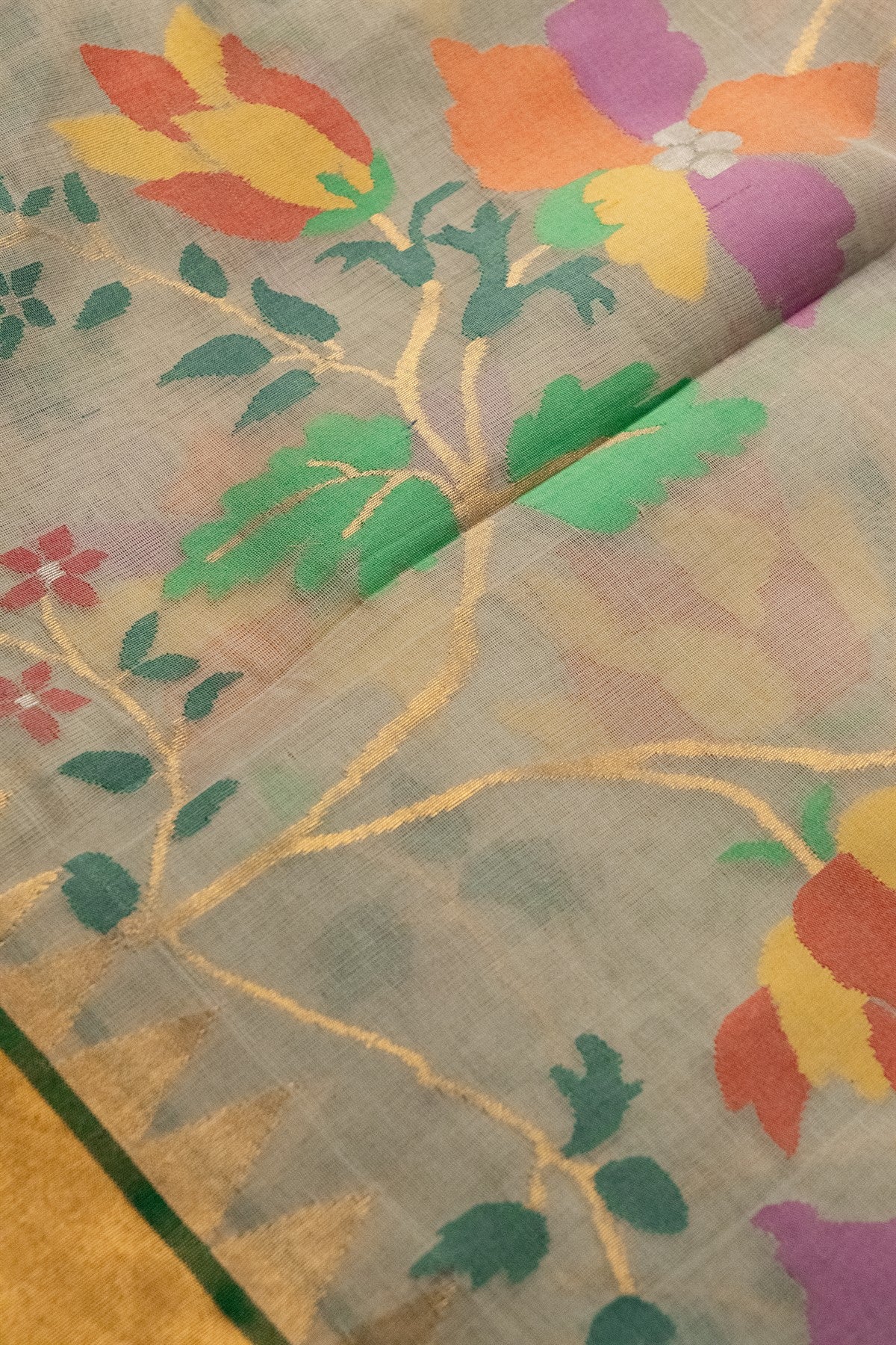 Mandir Light Grey & Green Jamdani Curvy Jaal Saree