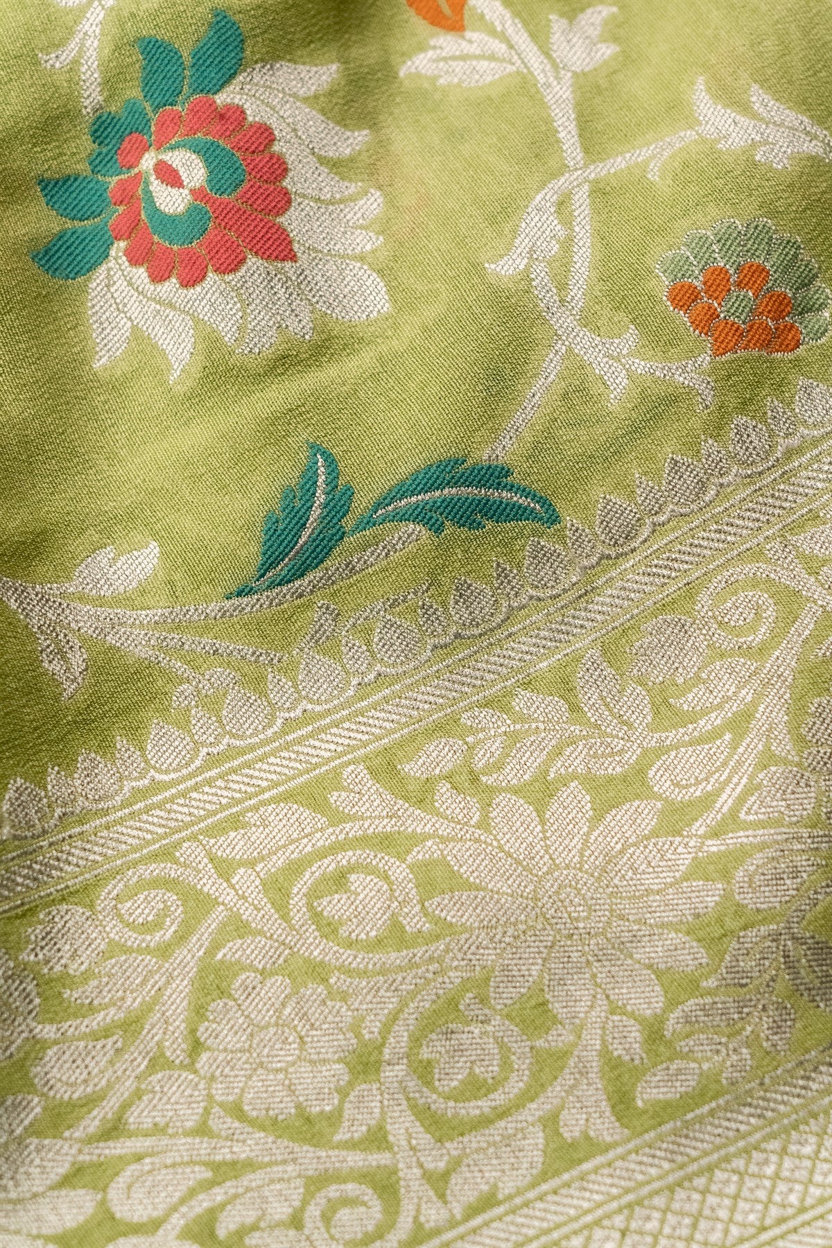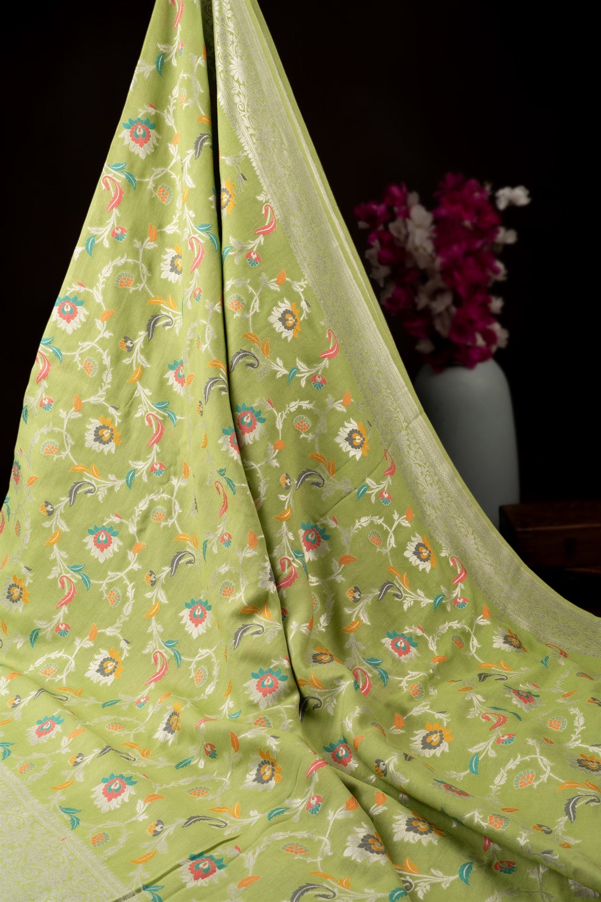 Mandir Pista Green & Silver Banarasi Floral Jaal Saree