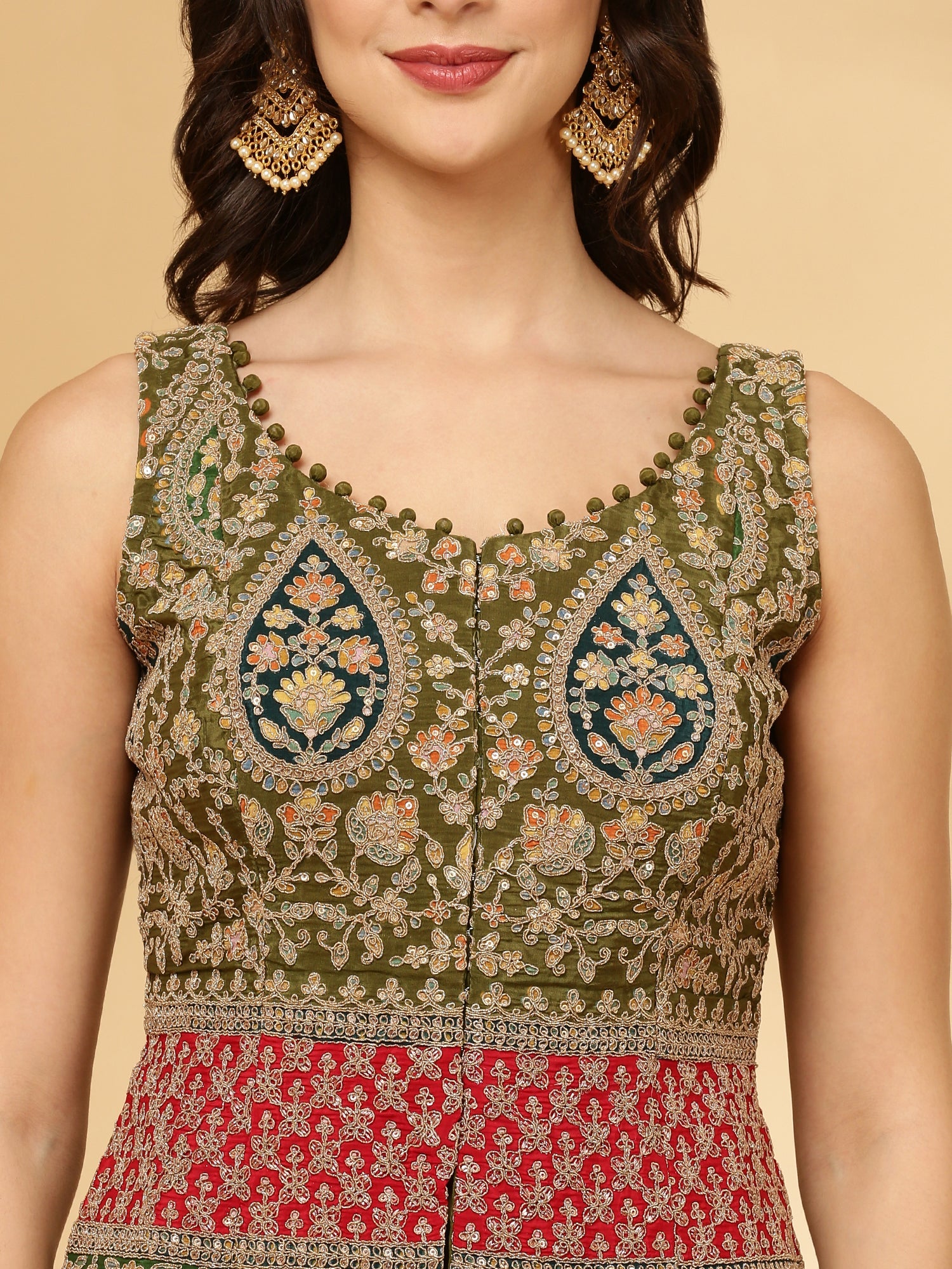The Mehadi Green Chinnon Crop Top Palazzo Set offers a refined blend of comfort and style. Crafted from lightweight chinnon fabric, the set features a tailored crop top paired with elegant palazzo pants, creating a flattering silhouette. Its rich mehadi green color adds depth and sophistication, making it ideal for both casual and semi-formal occasions. This ensemble effortlessly elevates your wardrobe with understated elegance.