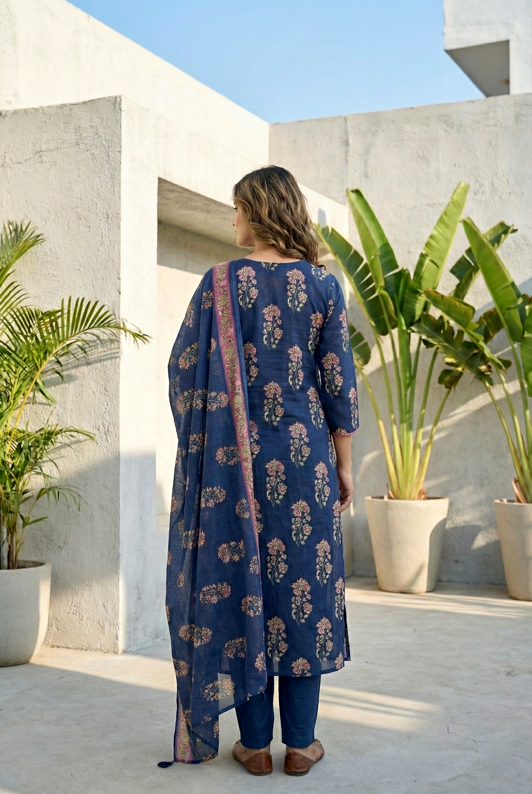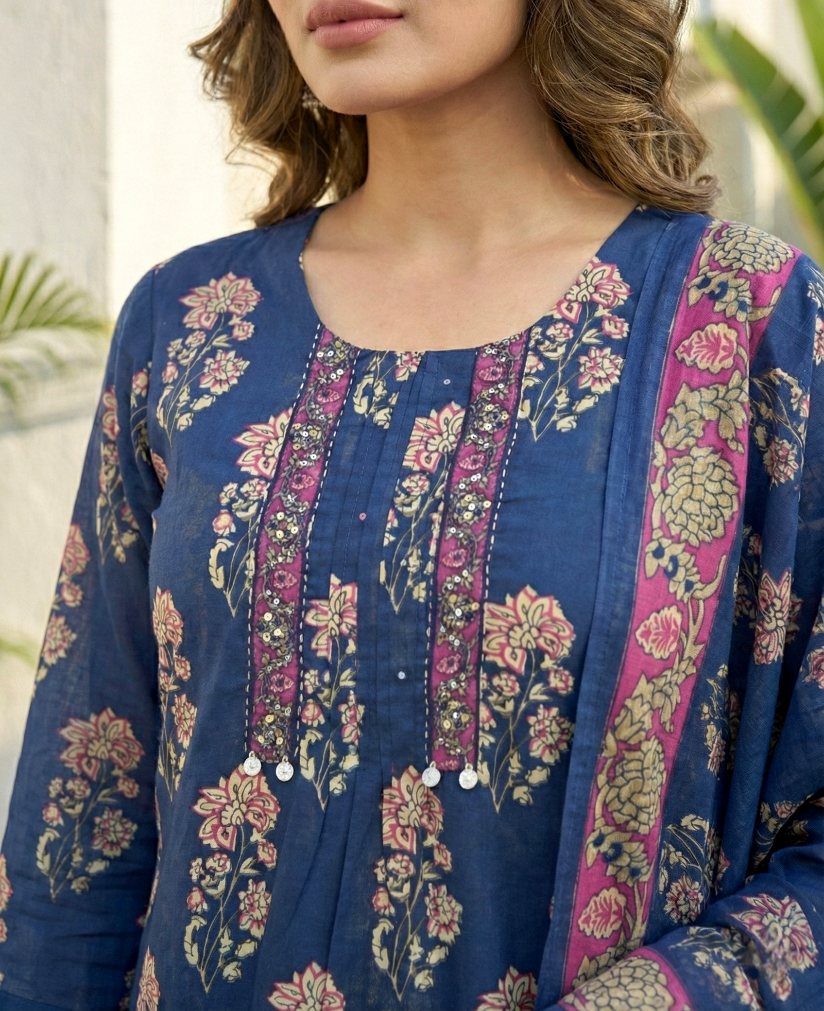 Navy Blue Cotton Floral Digital Printed Three Piece Set Embrace timeless elegance with this stunning three-piece ensemble in rich navy blue. Crafted from soft, breathable cotton, this set features beautiful digital floral prints that bring nature's charm to your wardrobe. Perfect for everyday wear or special occasions, the coordinated pieces work seamlessly together, giving you versatile styling options. The quality cotton fabric ensures comfort throughout the day while maintaining its vibrant colors wash after wash. Ideal for those who appreciate classic designs with a modern touch.
