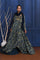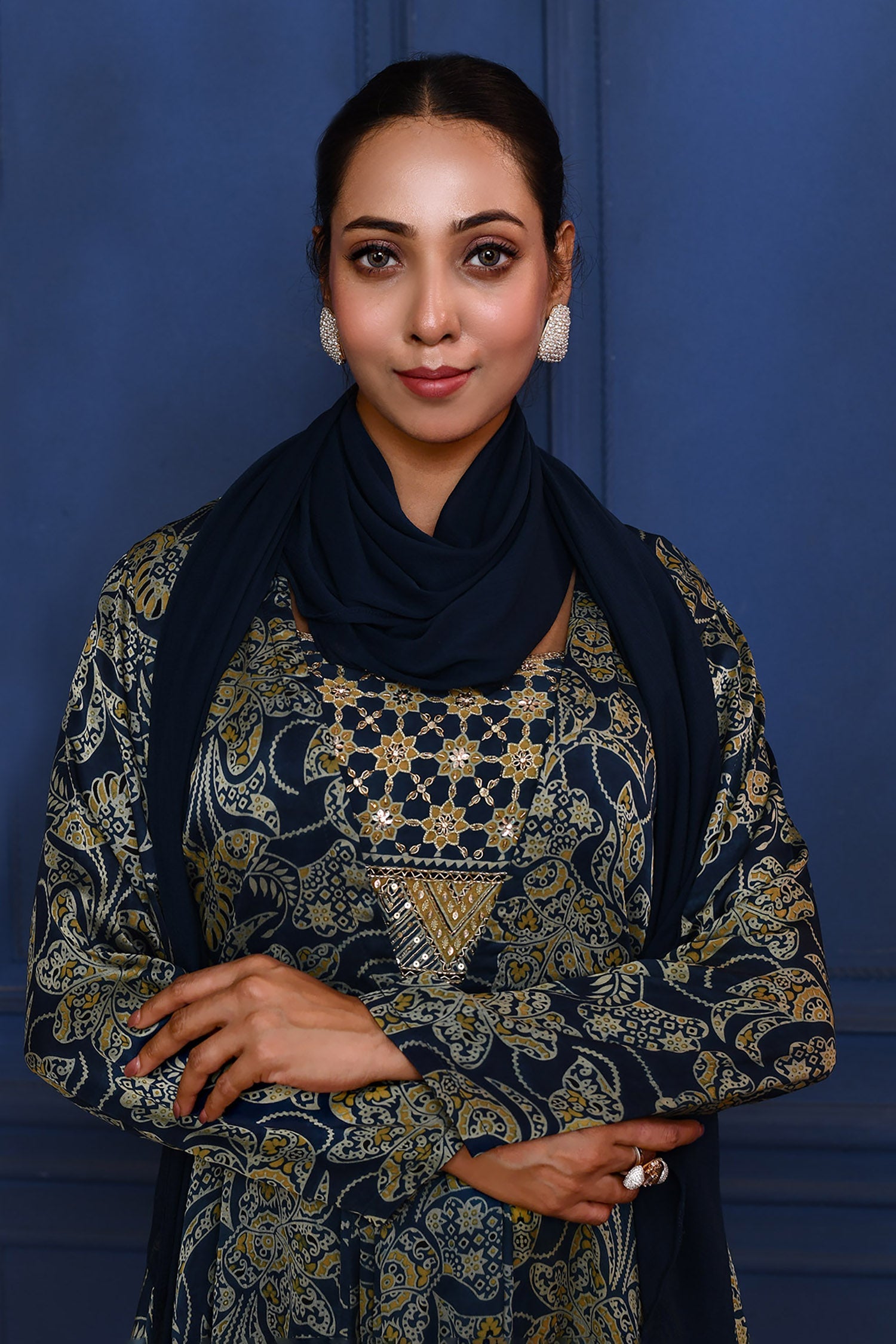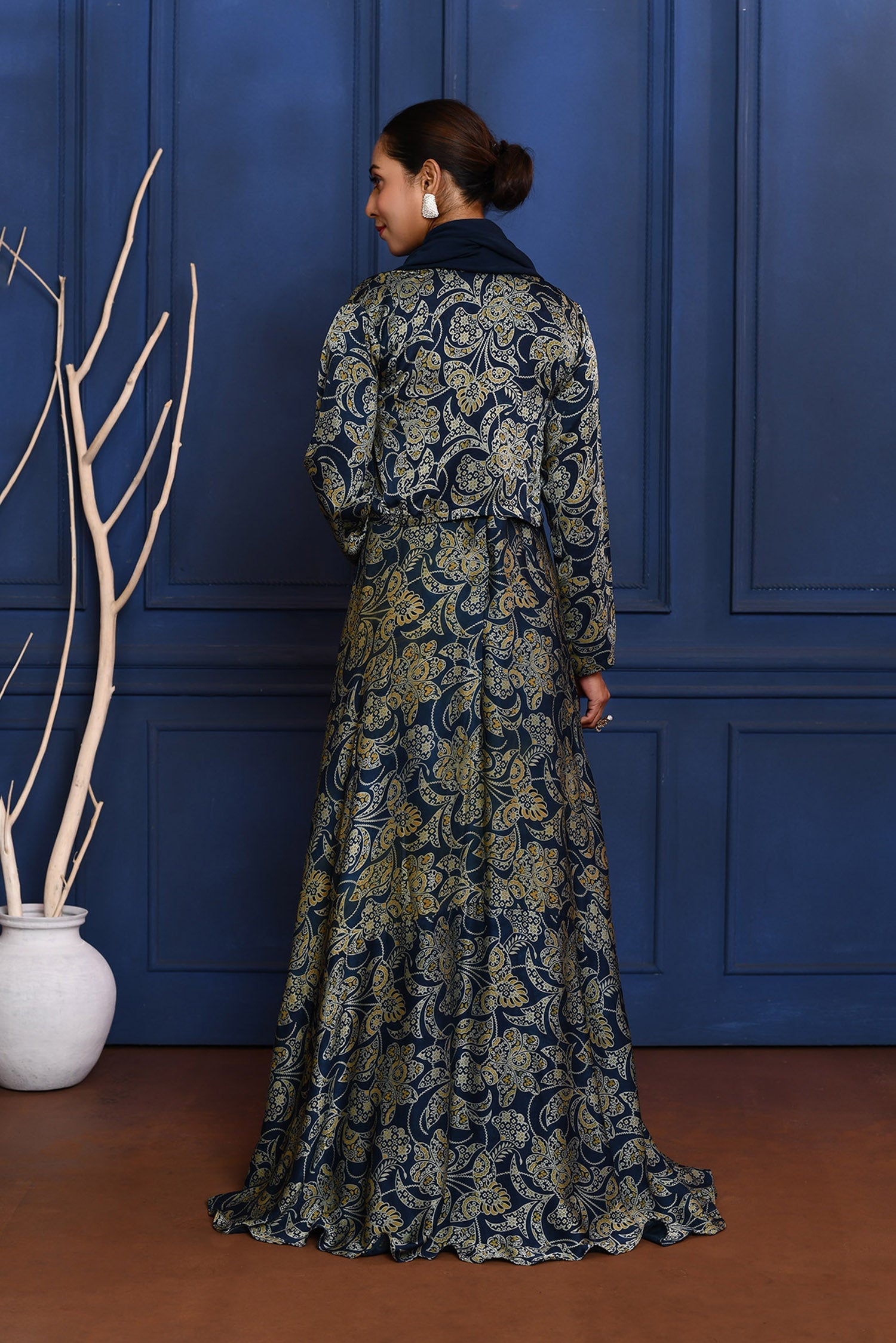 The navy blue floral printed satin anarkali set with matching short jacket and georgette dupatta for a blend of traditional look with modern elegance.