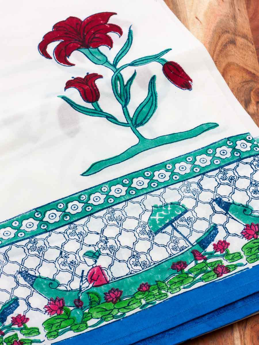 Kerala is an eternal poetry, one that begins with a magical sunrise and flows into floating lotus gardens. The fishermen at work in the pristine Kumarakom Lake, the tea estates, herds of majestic wild elephants in Munnar and colors of tropical trees, fruits, and flowers complete this poetry. And, the highlight is its biggest festival, Onam that celebrates the season of harvest. It is this time of the year that the city is bejeweled with festive fervor and joy. One of the many celebrations during this time is Vallam Kali (Boat Race), and Chundan Vallam is the boat used for this race. Meticulously crafted, these boats are popularly referred to as snake boats for their unique construction which has a rising rear and a long tapering front, resembling a snake with its hood raised. Tastefully decorated with green and scarlet silk umbrellas, we found our muse in these majestic vehicles that can carry as many as 128 paddlers. Each boat belongs to a village and is sacred. Our hand block story Onam centers around Chundan Vallam, a particularly complex motif to have been created and worked upon. The majestic elephant, gorgeous flowers, lotus, and plantain with a stunning pink bud complete the story. Our tribute to God's own country!