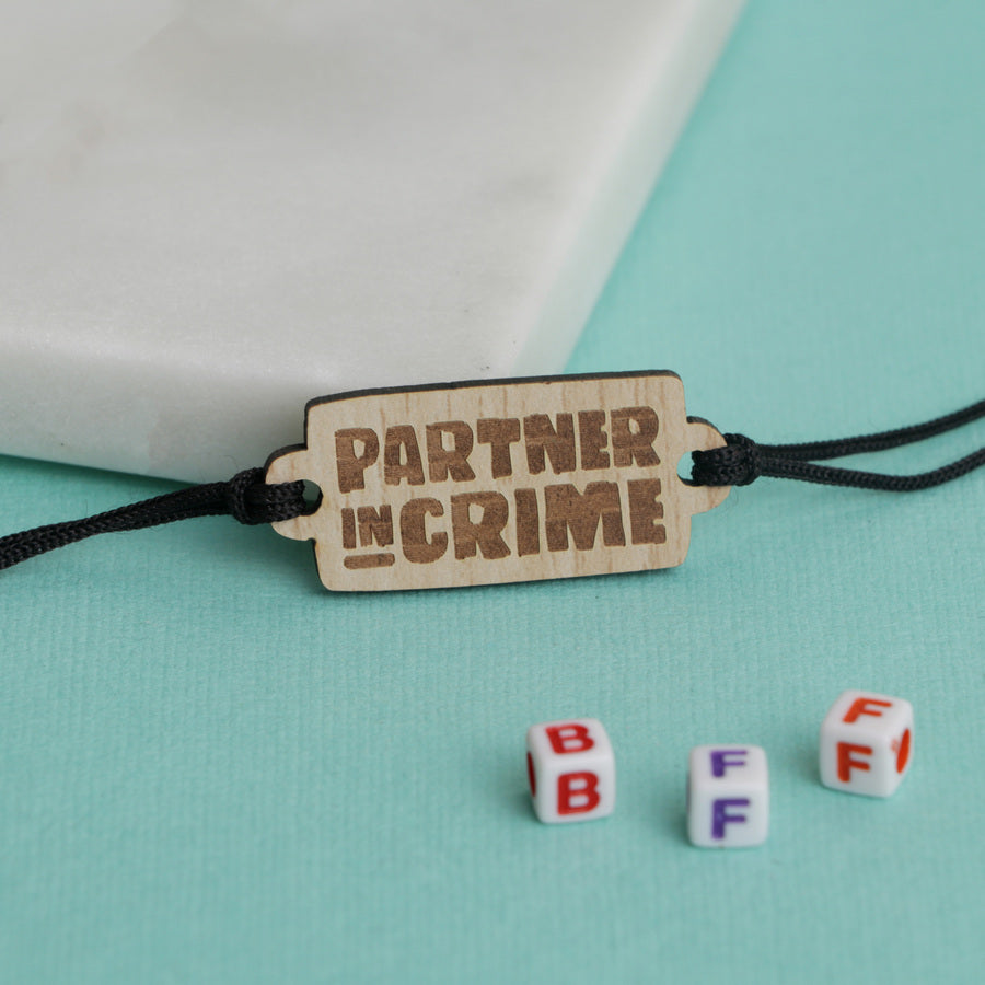 The band comes with a wooden centerpiece engraved with 'partner in crime'—perfect for your forever-there-for-you friend!