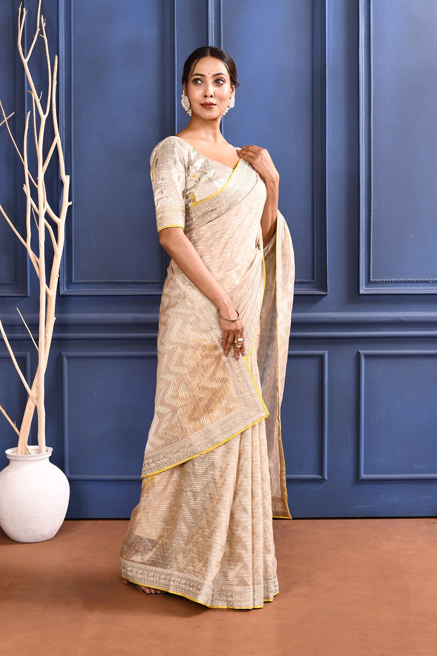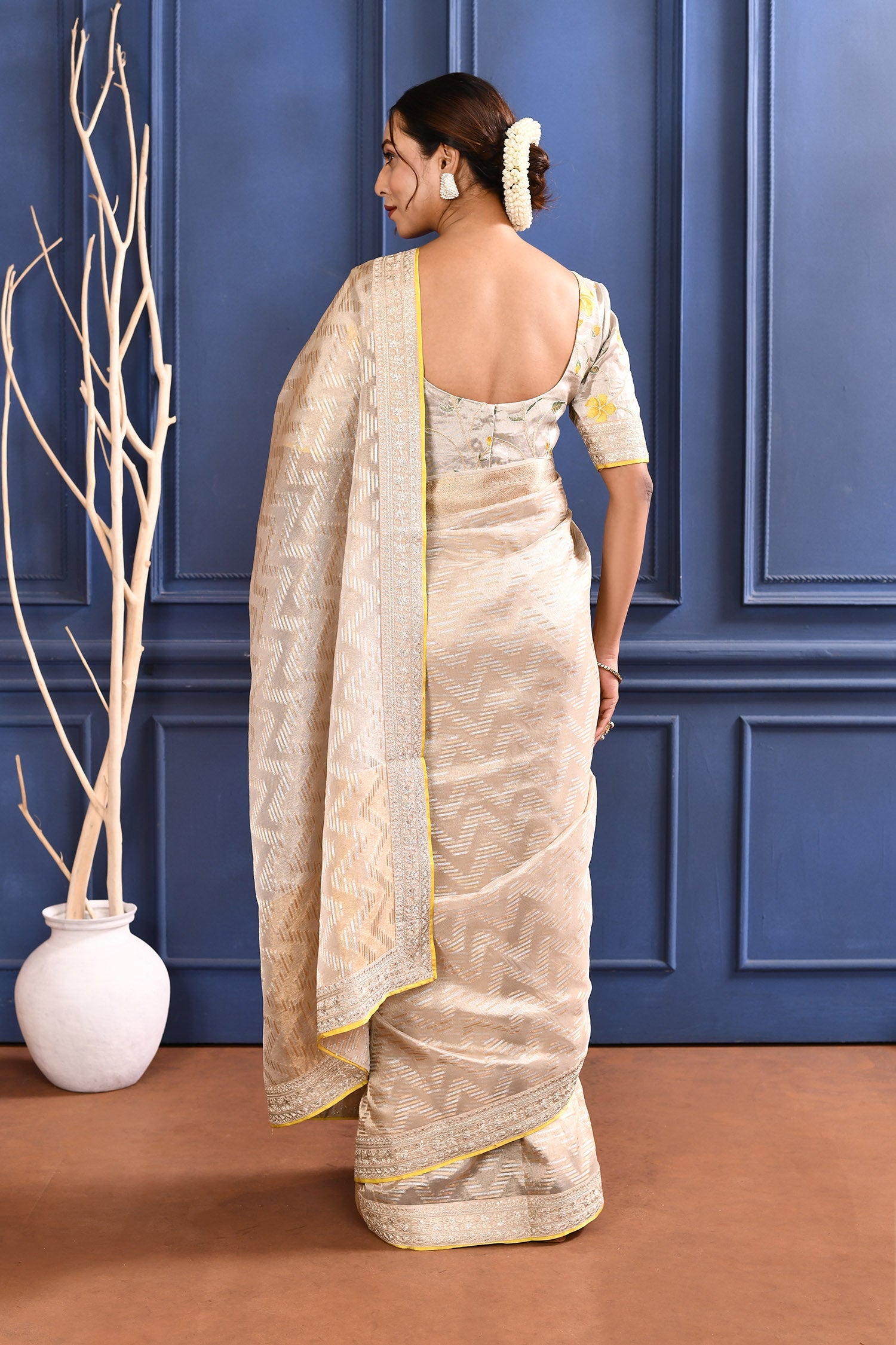 The pastel golden embroidered tissue saree with border highlight and stitched embroidered silver blouse for a stylish look with traditional elegance.