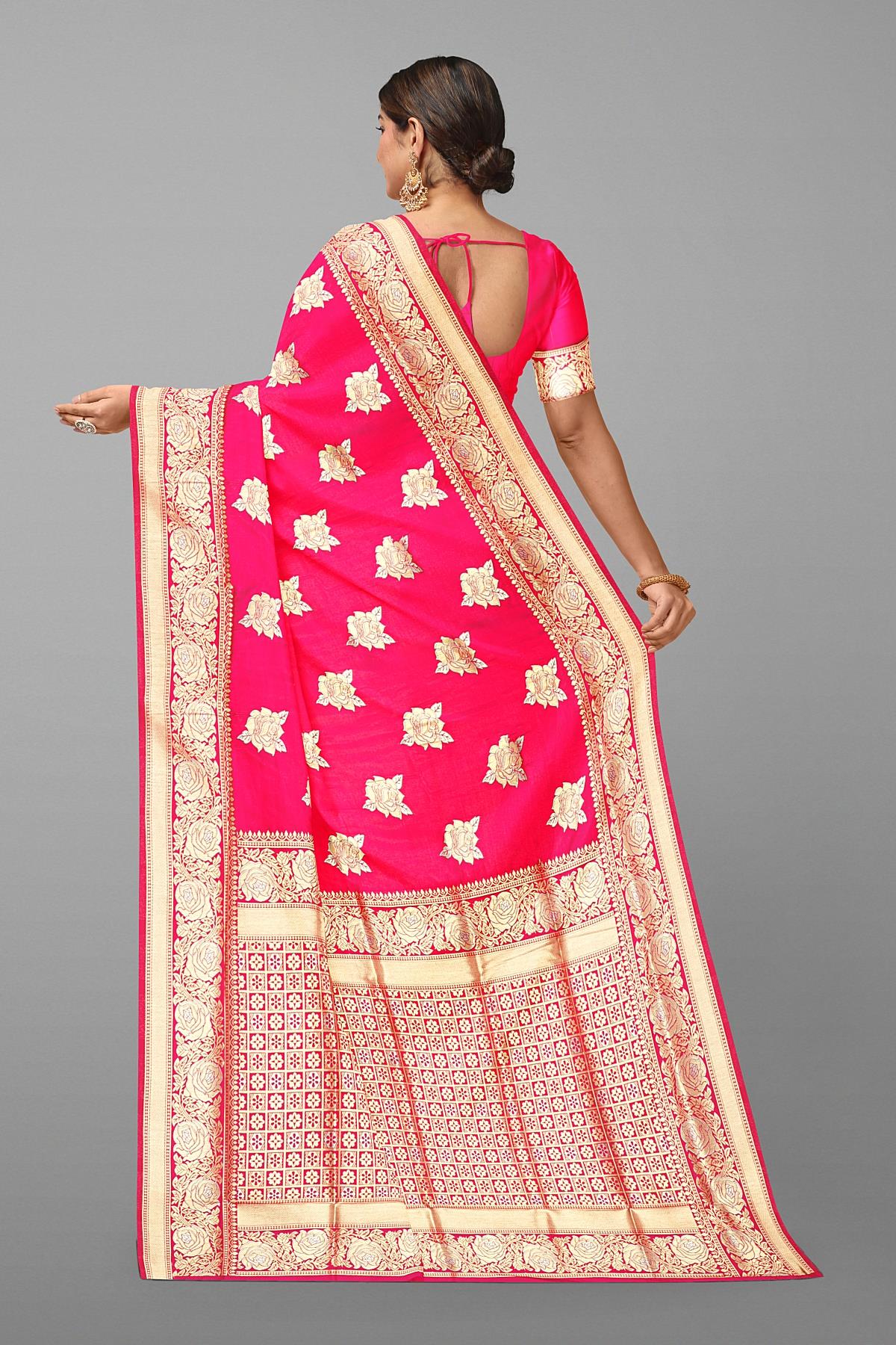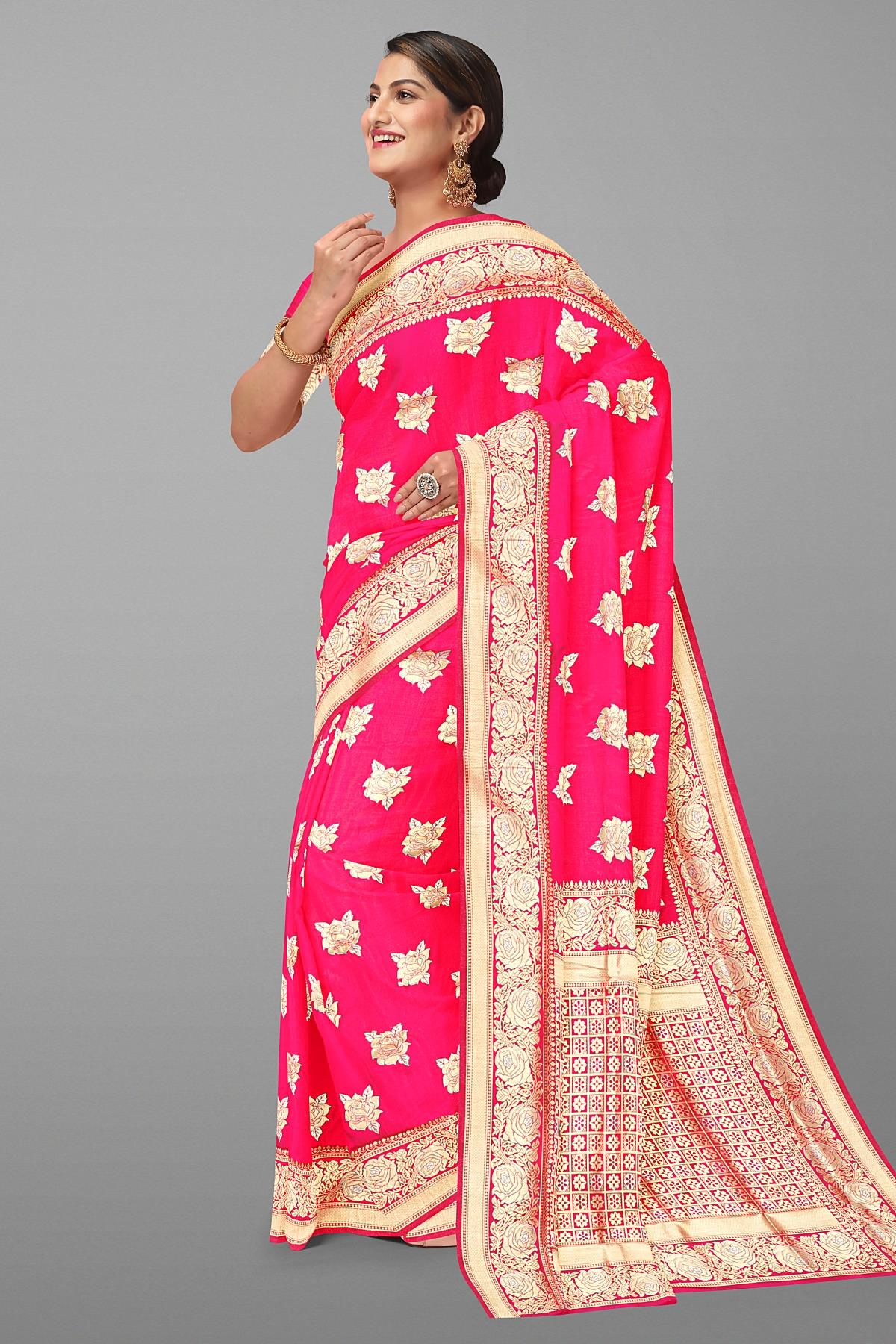 Latest PINK BUTTIS SILK BLEND Saree with SELF ZARI border. This saree comes with PLAIN WITH BORDER SILK BLEND blouse.
