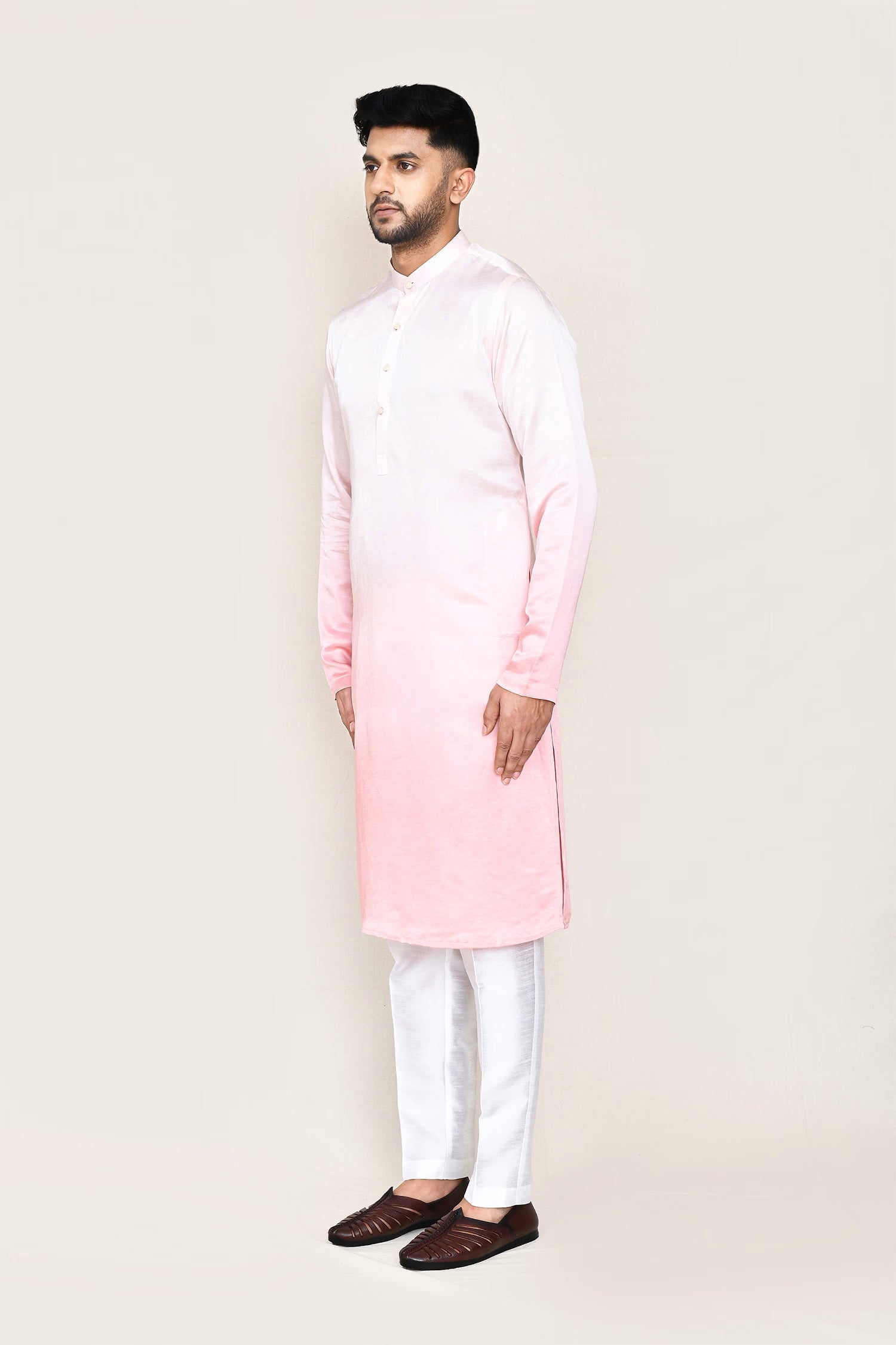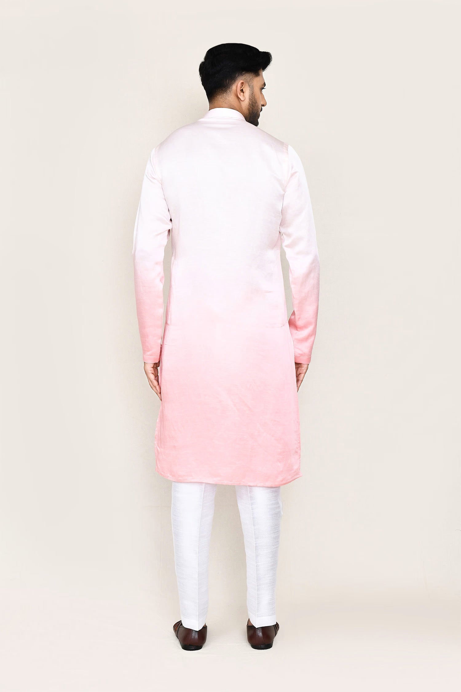This pink gradient satin silk kurta set has silk base with collar neck and plain kurta paired with white silk pant, makes it simple and graceful to wear it at any occasion.