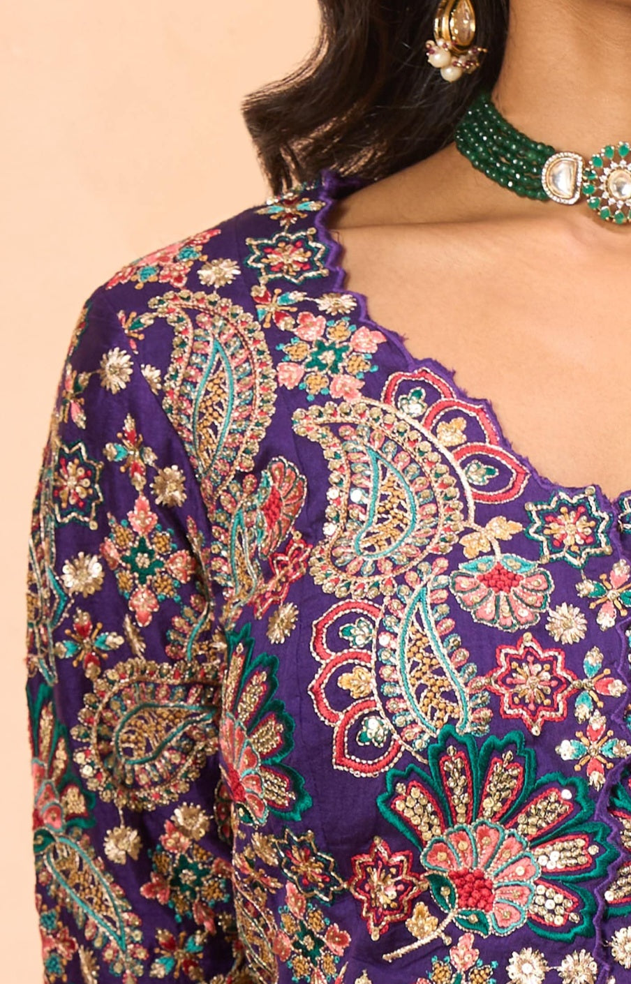 Purple Indo-Western Ensemble with Mrunal Rao Pattern & Multicolor Thread Work | Chinnon Fabric Plazo