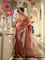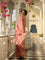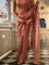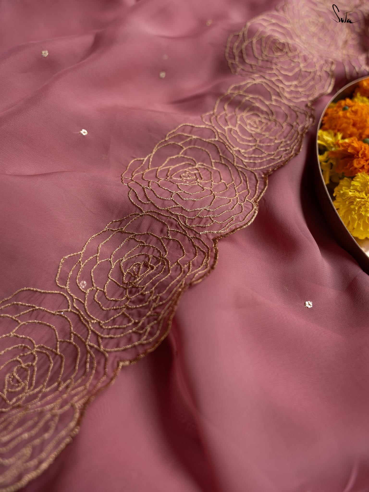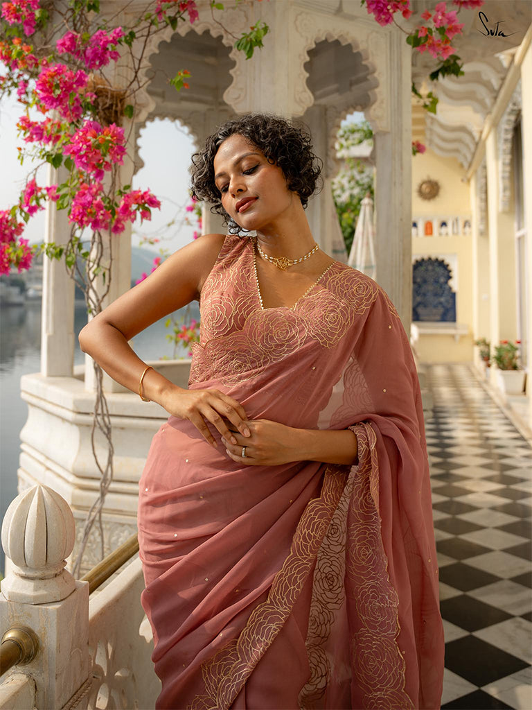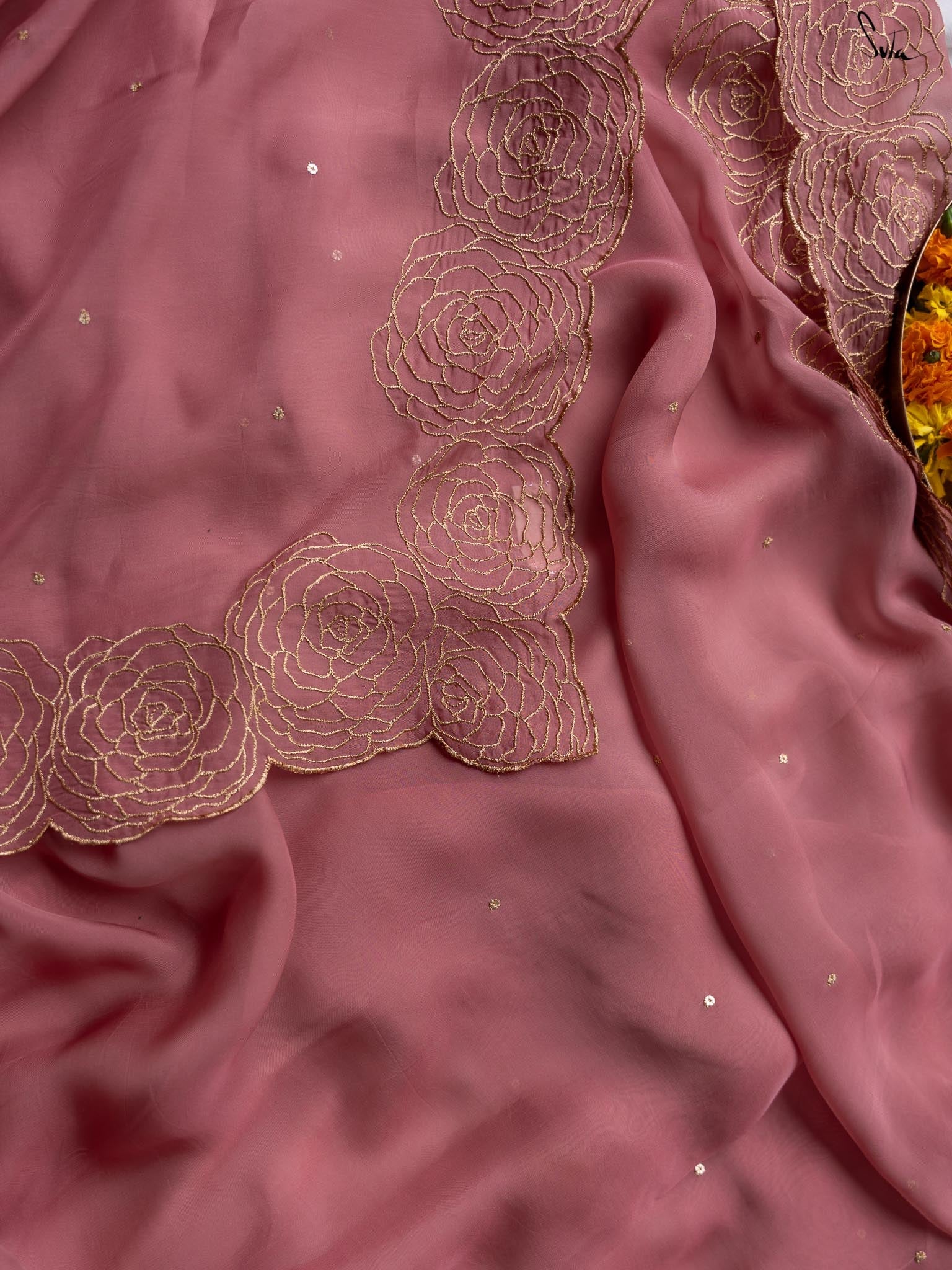 This dusty pink saree is crafted from viscose organza fabric with intricate golden zari embroidery, creating a fractal of beautiful roses. Sequins dancing all over the saree are the optimal final touch.