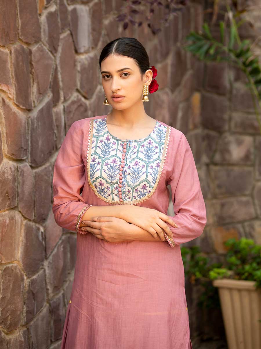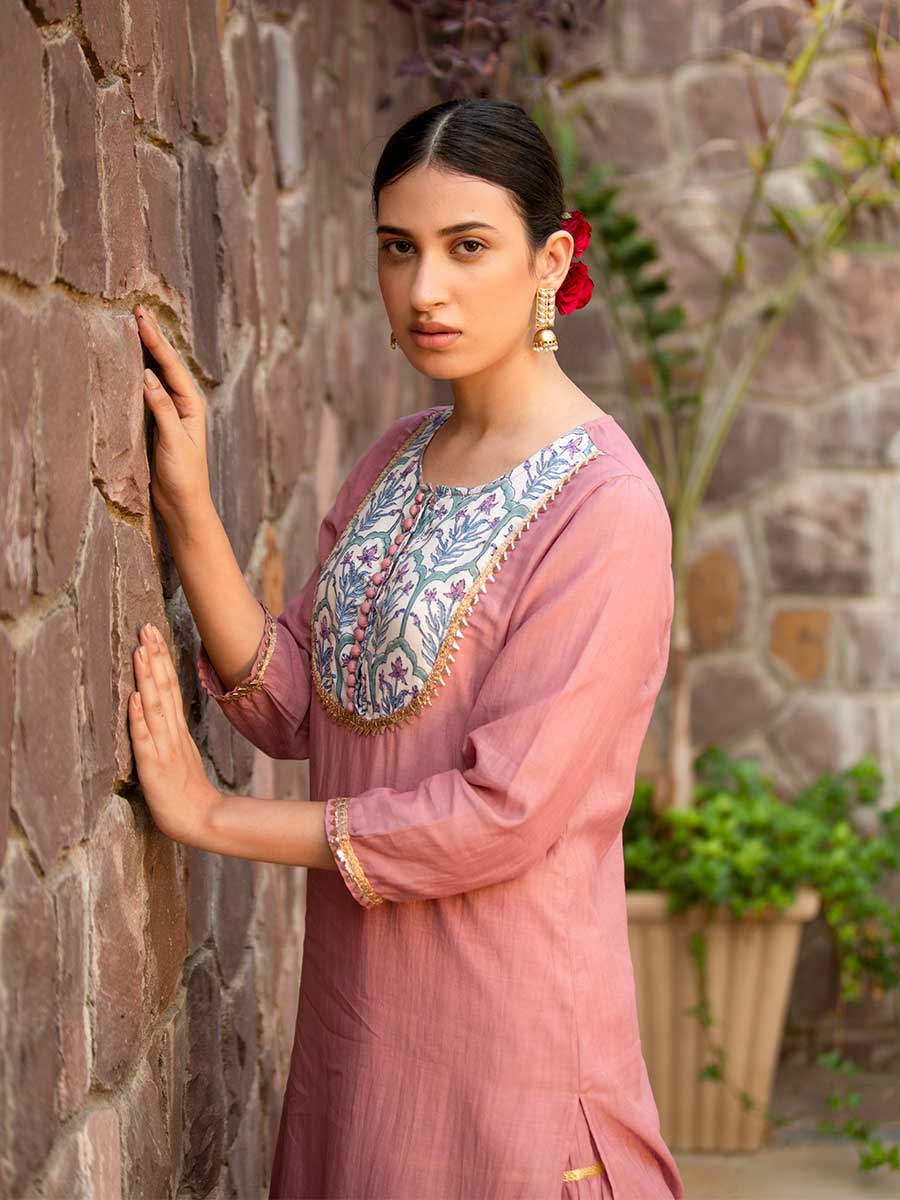 An elegant sharara set made in cotton viscose with hand block printed yoke and gota lace work. Dress it up with silver or gold jewellery and mojaris to complete the look. Our model is 5'6" and is wearing S. Note: Ships in 2-4 days.
