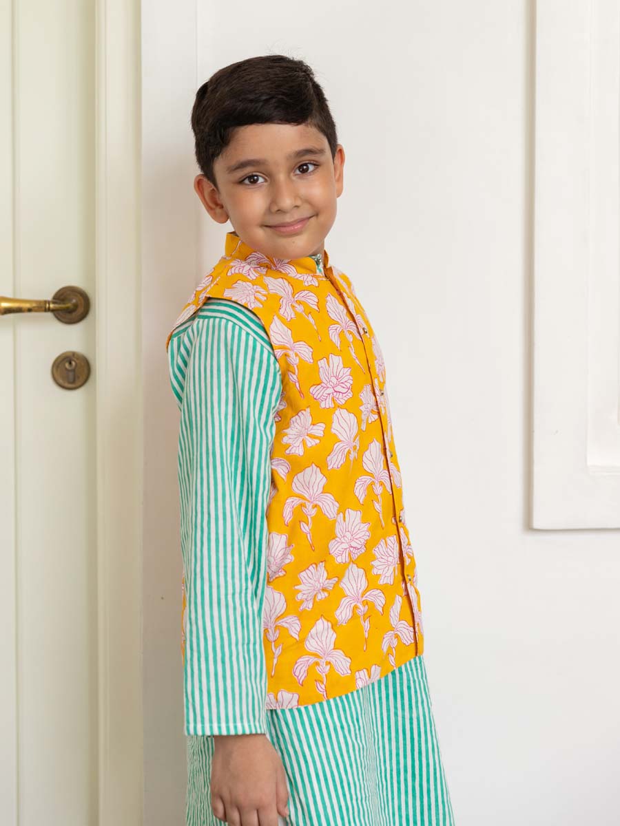 Set of 3 - Adwait Organic Cotton Block Printed Long Kurta with Jacket