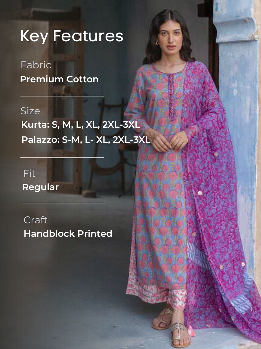 Set of 3 - Ishaani Cotton Kurta, Palazzo and Dupatta