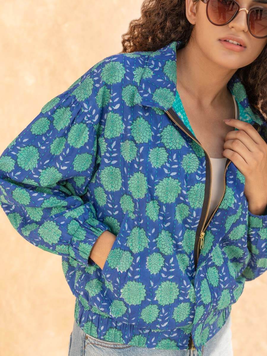 Sherpa Kantha Embroidered Block Printed Bomber Jacket