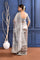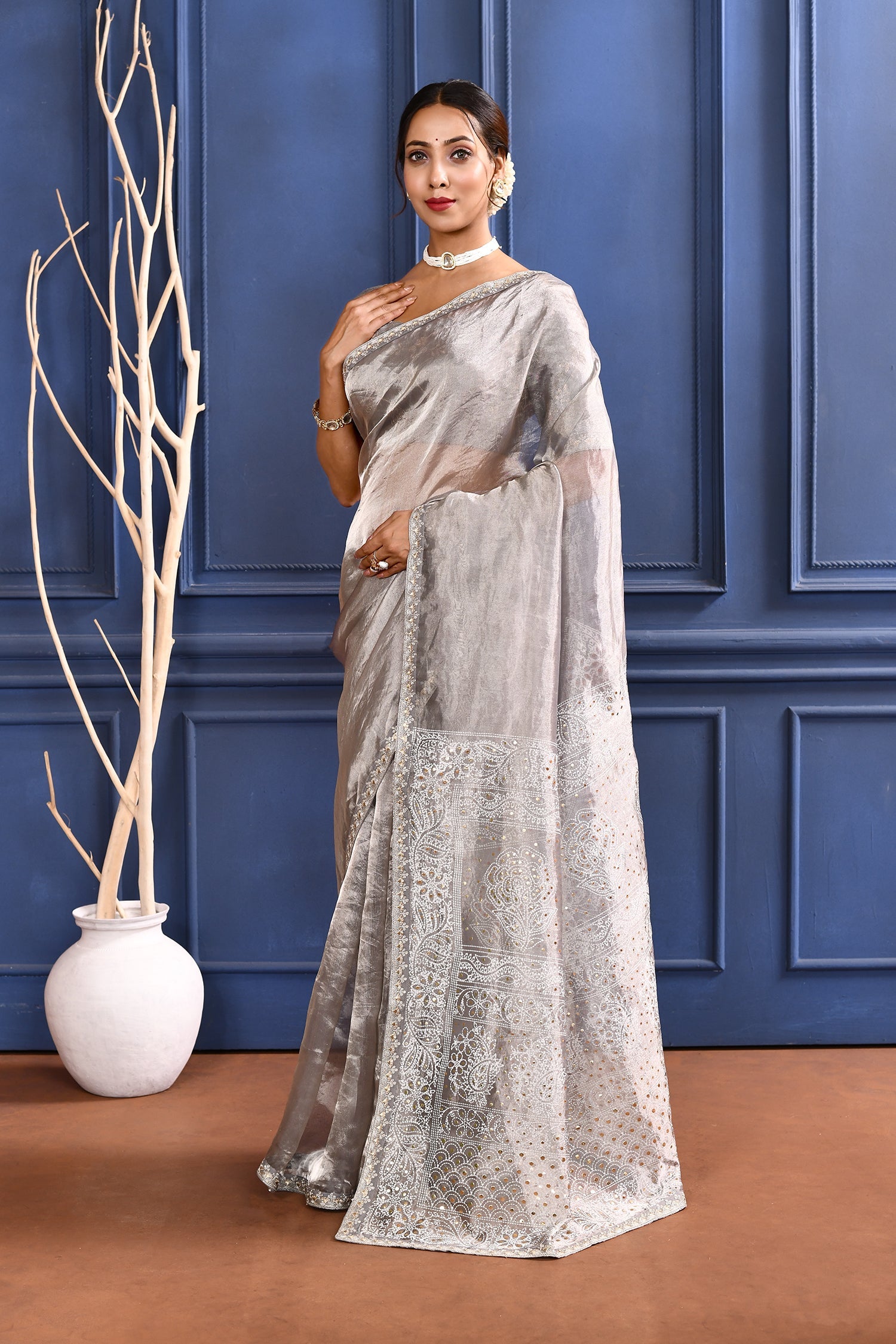 The silver foil printed tissue saree with embroidered self border and blouse for a rich look along with foil printed floral design for subtle grace.
