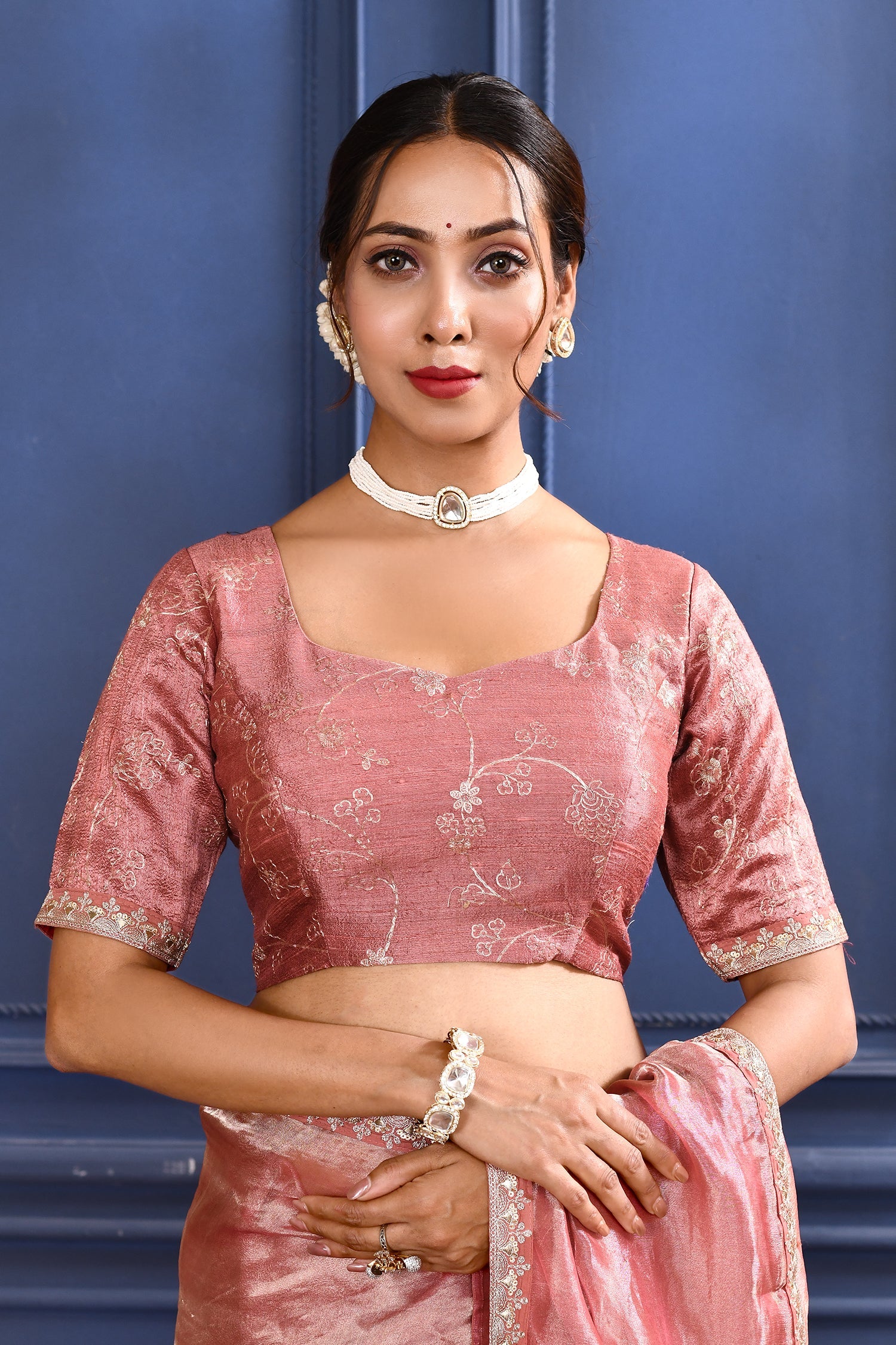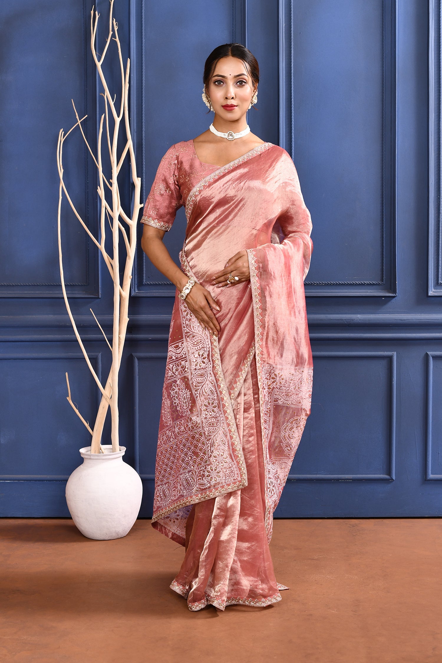 The soft pink foil printed tissue saree with embroidered self border and blouse for a rich look along with foil printed floral design for subtle grace.
