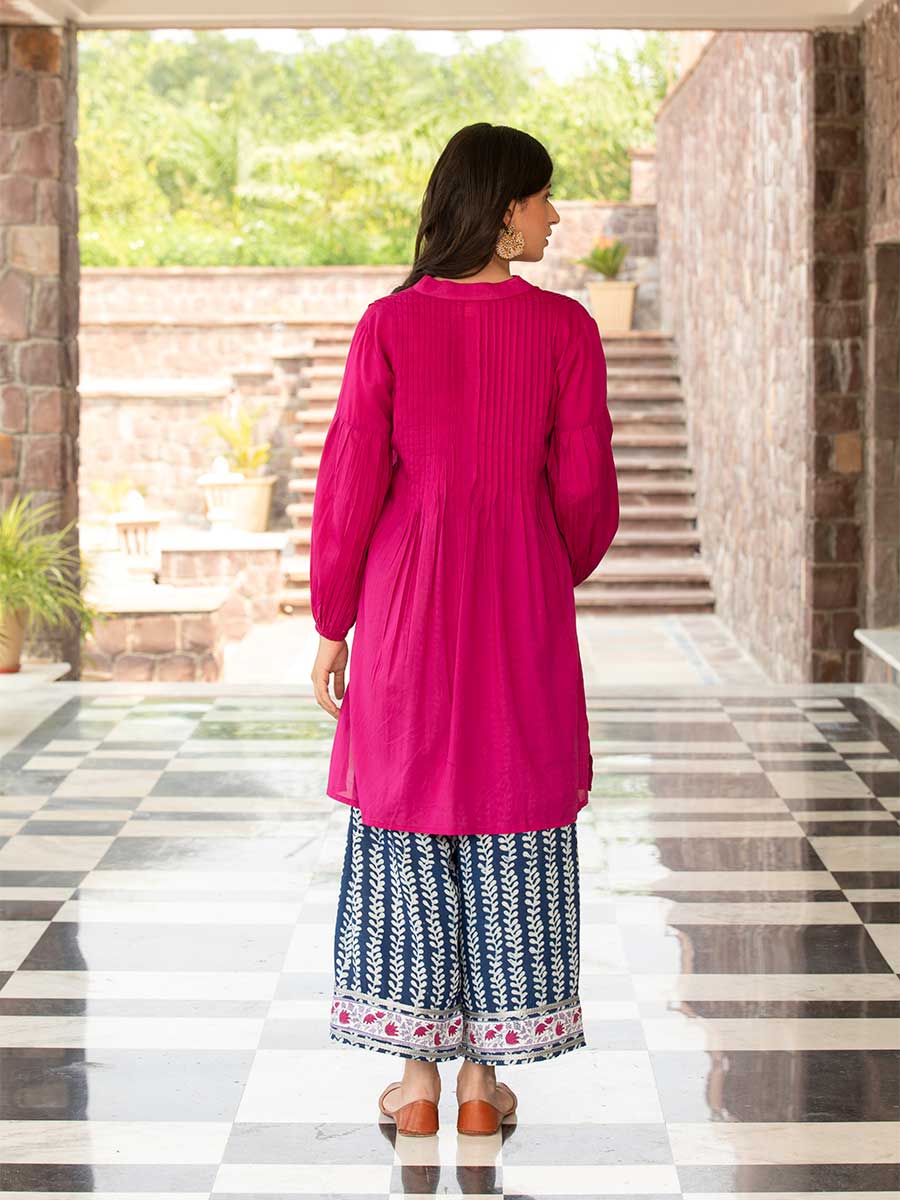 A flowy fuchsia modal dyed shirt kurta featuring dense pintucks all over its bodice and sleeves giving it a gorgeous structure and style. A versatile shirt that can be seamlessly paired with Indian and western bottoms or worn as a dress. Our model is 5'6" and wearing S.