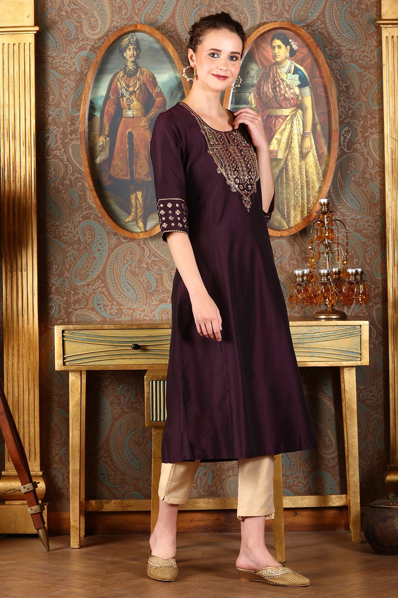 A portrait of regal elegance, this kurta set for women in a stunning Royal Plum hue is designed for moments that matter. The ensemble flows with you, featuring a classic A-line silhouette that offers both comfort and a flattering, graceful drape. Your eyes are immediately drawn to the lavishly embroidered yoke, where intricate Zari work in threads of gold, green, and red creates a mesmerizing tapestry of traditional motifs. This detailed ornamentation continues as a beautiful border on the cuffs of the elegant three-quarter sleeves, which are finished with delicate scalloped edging for an extra touch of artisanal charm. The graceful scoop neck adds a touch of modern femininity to this timeless kurti set. Crafted from a fabric with a subtle, luxurious sheen, the calf-length tunic feels as beautiful as it looks and is fully opaque for confident wear, ending in a clean, straight hemline. This complete ethnic co-ord set includes comfortable, contrasting straight pants and a coordinating dupatta, offering a polished look right out of the package. It’s the perfect festive A-line kurta set for making an impression at weddings, celebrations, and evening soirées, blending heritage craft with contemporary style.