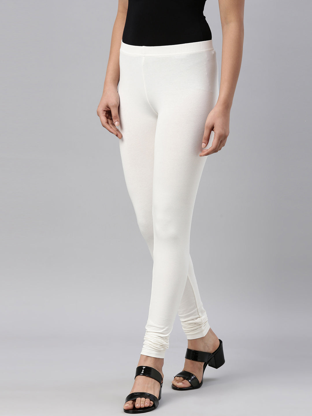 Go chic with a pair of Cream Solid Churidar Leggings. Made from high quality cotton, it has a elasticised waistband & gathers at the hemline.
